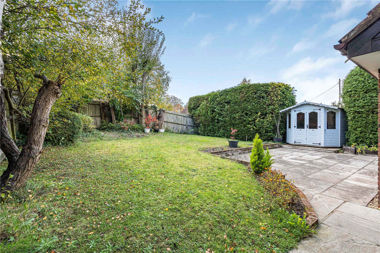 The rear garden features large patio with brick surround, with a useful side area with further terrace and garden store. There is an area for vegetables, a