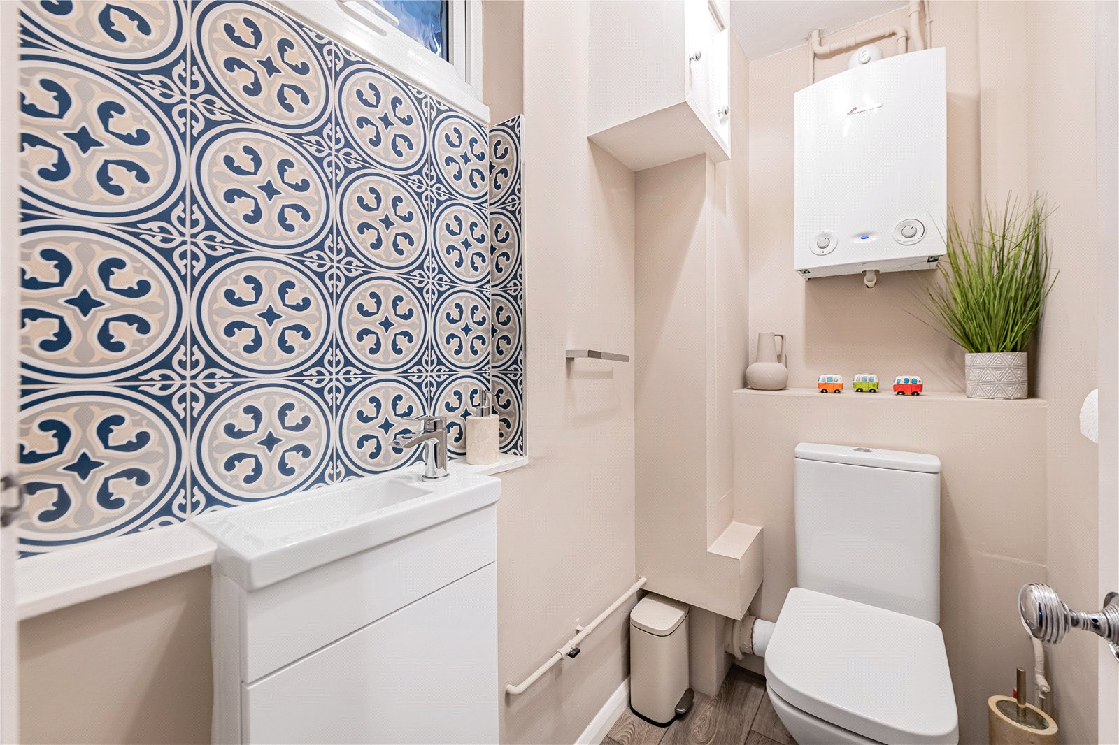 Cloakroom : Modern suite comprising vanity unit with decoratively tiled wall and WC. Meter cupboard, shelf, wall mounted gas boiler, grey oak effect flooring.