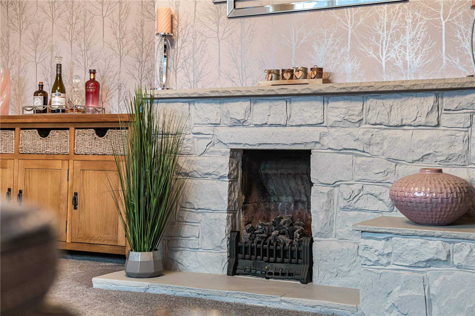 Sitting Room : Delightful square formal reception room with wide picture windows and fireplace with fitted gas fire and stone surround. Recesses to either side with space for television with television point, telephone point, radiator and contrasting wall with decorative wall paper.