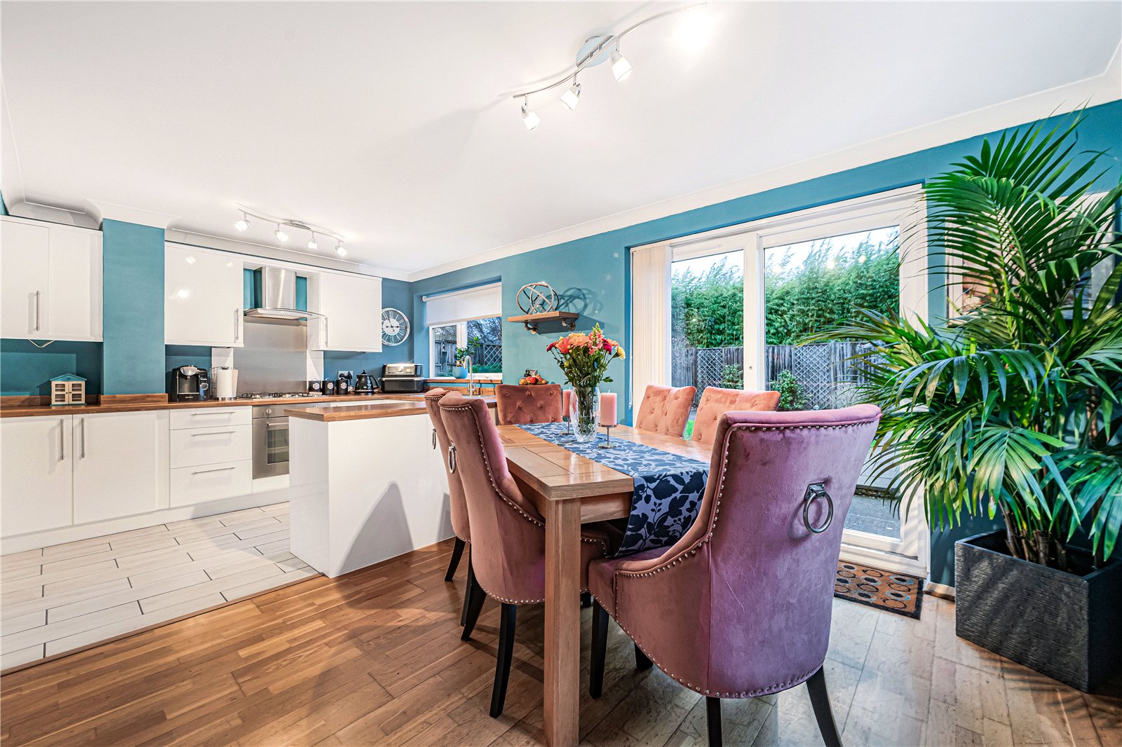Dining Area: Lovely double aspect room with sliding patio door to outside. Beech laminate flooring, space for dining table and chairs, radiator and light point.
