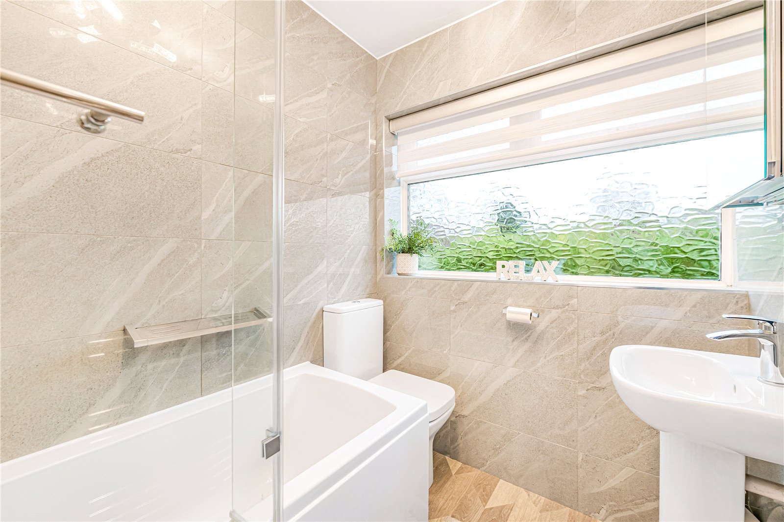 Bathroom : Modern suite comprising p shaped shower bath with screen and wall mounted shower, WC and washy hand basin. Tiled walls, chrome ladder radiator, grey vinyl flooring and shelf.