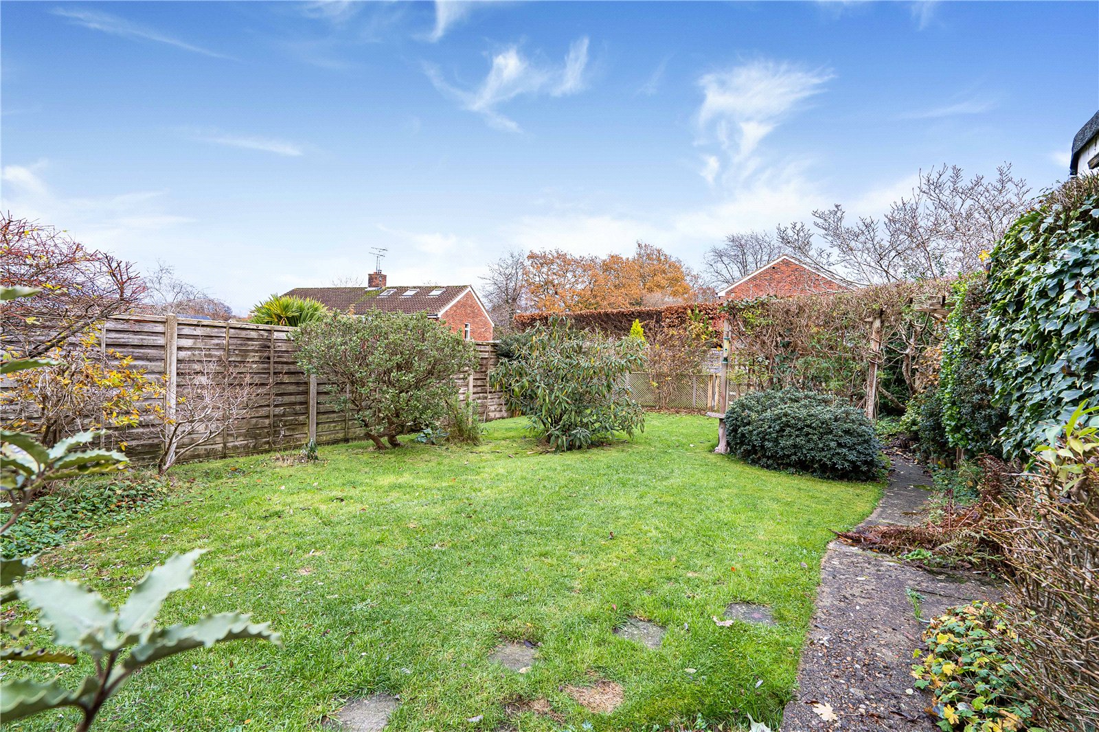 Garden :To the front of the property is a paved terrace with borders and a side gate giving access to the rear. The rear garden is larger than average and comprises a formal lawn with beds and specimen shrubs and bushes and a delightful rearterrace for seating. A pathway at the side leads through a trellis to a gate opening into a large informal garden ideal for vegetables, orchard and greenhouse. The whole is well screened for privacy and faces east.