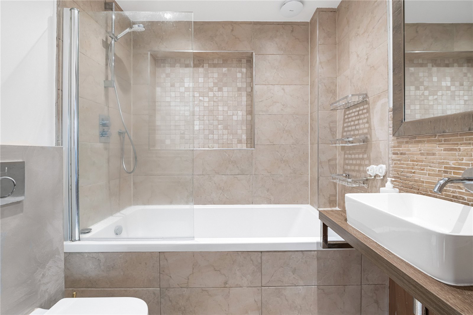 Bathroom : Modern suite comprising bath with screen and wall shower, WC with concealed cistern and wash hand basin with splash back. Part tiled walls, ladder radiator and downlights.