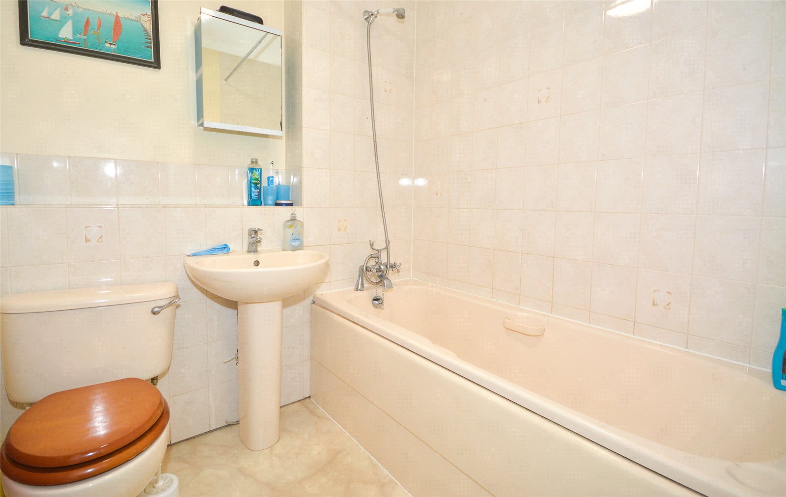 Bathroom : Comprising suite of bath with shower attachment, WC and wash hand basin. Part tiled walls and light point.