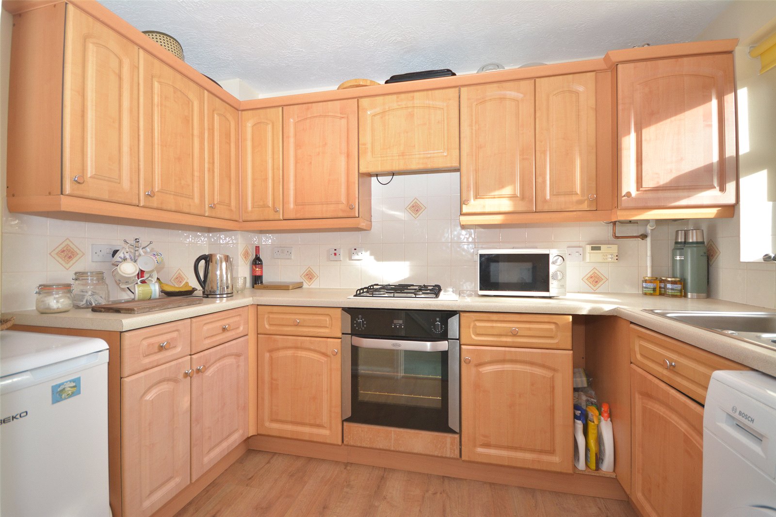 Kitchen : Good range of matching wall and base unites with spaces for washing machine and fridge freezer. Single oven with cooker hood and gas hob over, boiler cupboard housing Worcester gas fired boiler, part tiled wall and glimpse views through towards the South Downs. Range of work tops with sink unit, wood effect flooring and light point.
