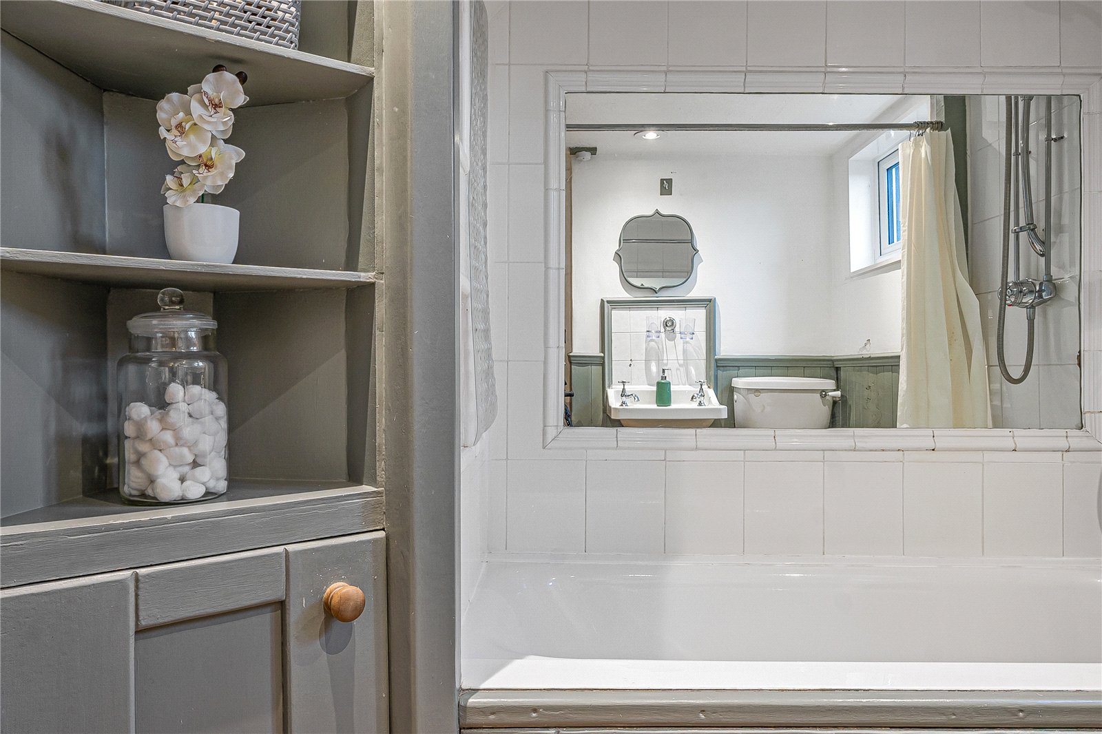 Bathroom: Panel enclosed bath with wall mounted shower and surrounding timber framing with adjoining cupboard and shelving. WC and wash hand basin, exposed wood floor, part panelled walls, large mirror, modern electric radiator and windows affording views to the South Downs in the distance.