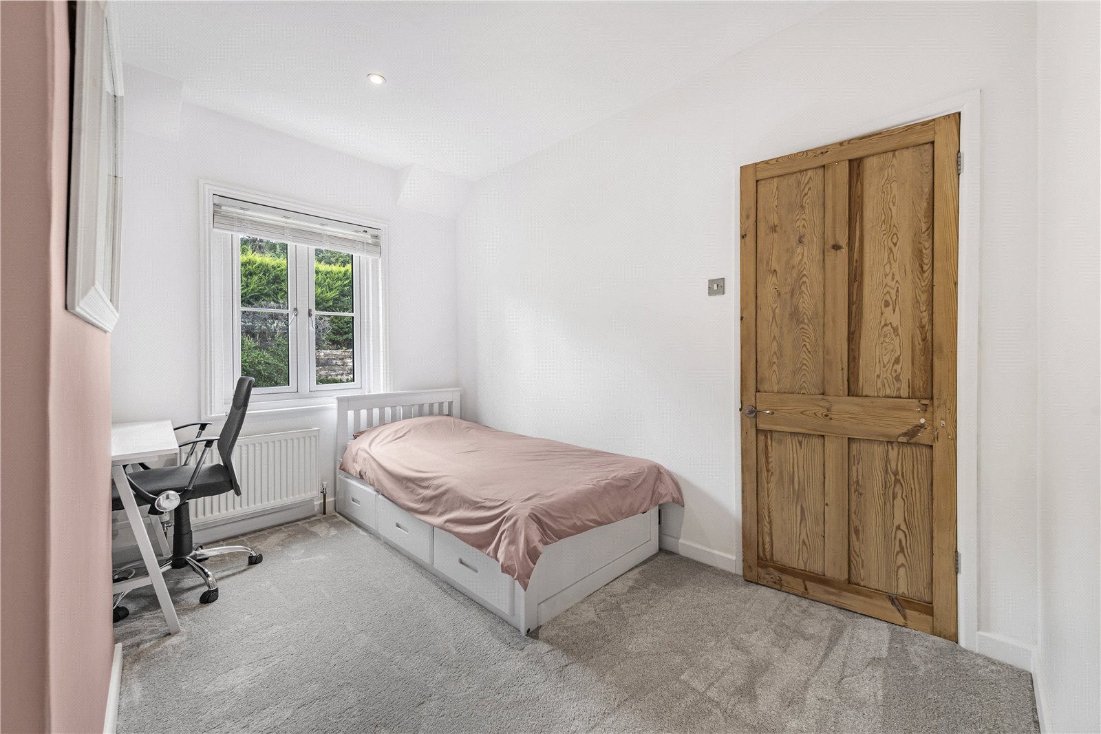 Bedroom : Outlook to garden, feature decorative wall paper, radiator and downlights. Space for wardrobe