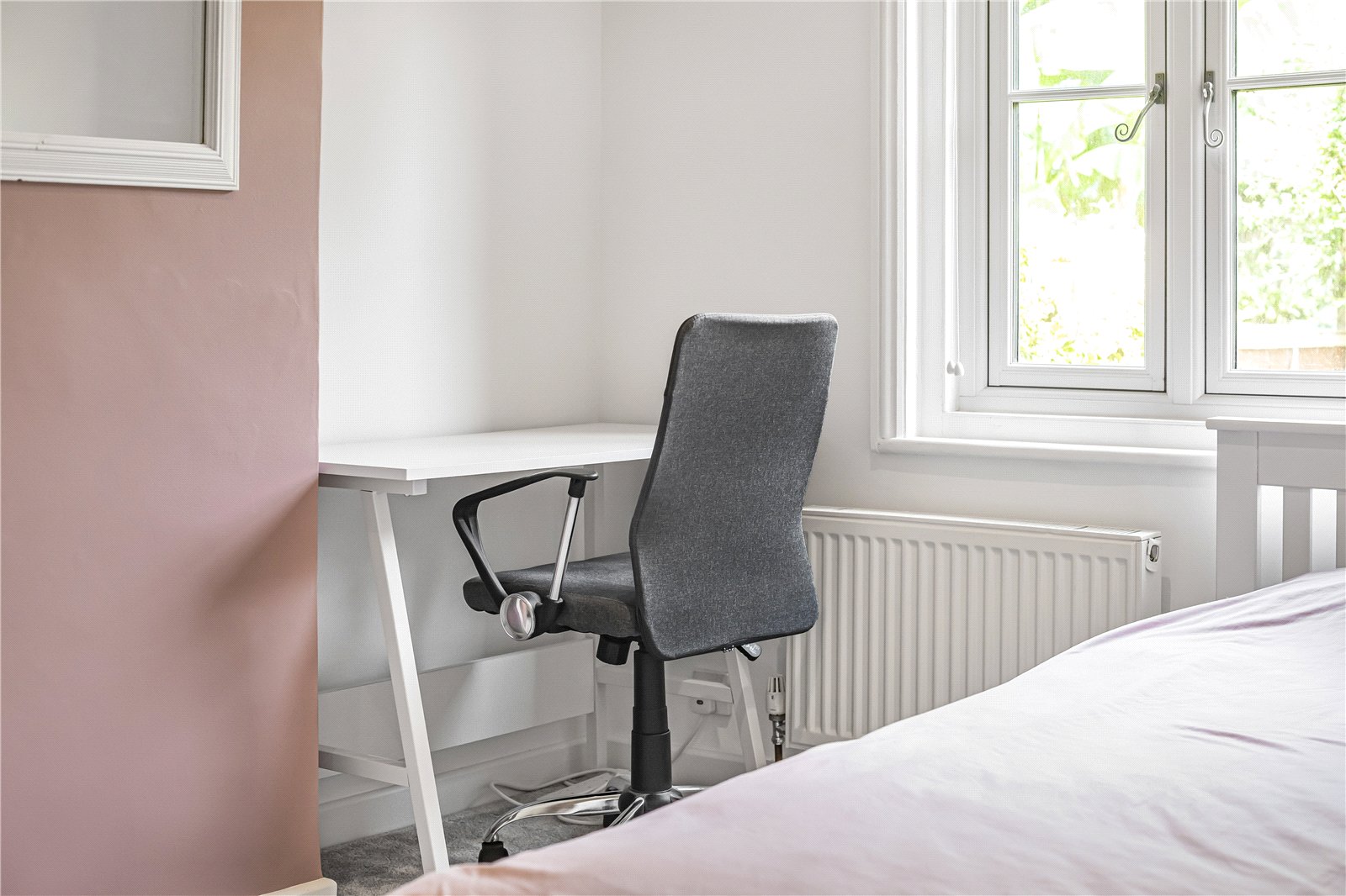 Bedroom 2 : View to garden, recess for desk, open cupboard and radiator.