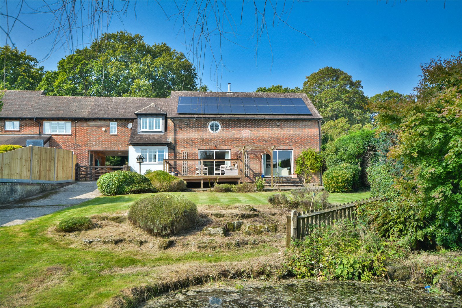 Garden : To the front of the property there is a garden laid to lawn flanking the driveway with the front plot well screened by mature hedges, shrubs and trees. The rear garden is approached under the arch by a gate and this leads to a concrete slope ideal for trailers etc. Immediately to the rear of the house is an elevated timber sun deck with wired railing offering far reaching views towards the South Downs. Adjacent is a lower paved sun terrace and this adjoins an upper garden laid to lawn. There is a large lower lawn and garden which features an ornamental pond with summer house overlooking it.