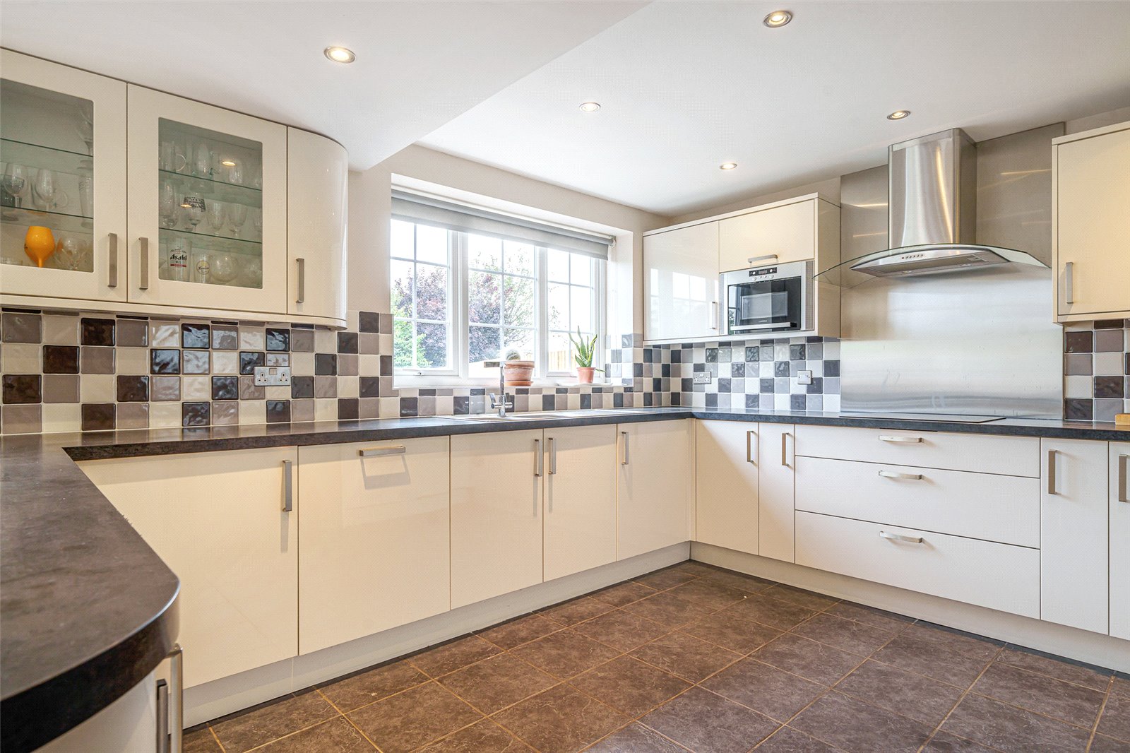 Modern Kitchen : Comprehensive range of modern kitchen furniture finished with gloss door fronts and incorporating pull out racks, carousel, wine cooler and rack, drawers and glazed display cupboards. Matching wall and base units with built-in tall oven housing with double oven, built-in microwave oven, built-in dishwasher, and space for American style fridge freezer. Range of work tops with double bowl sink and ceramic hob, stainless steel cooker hood and tiled floor. Views out to the garden and beyond. This space opens into :
