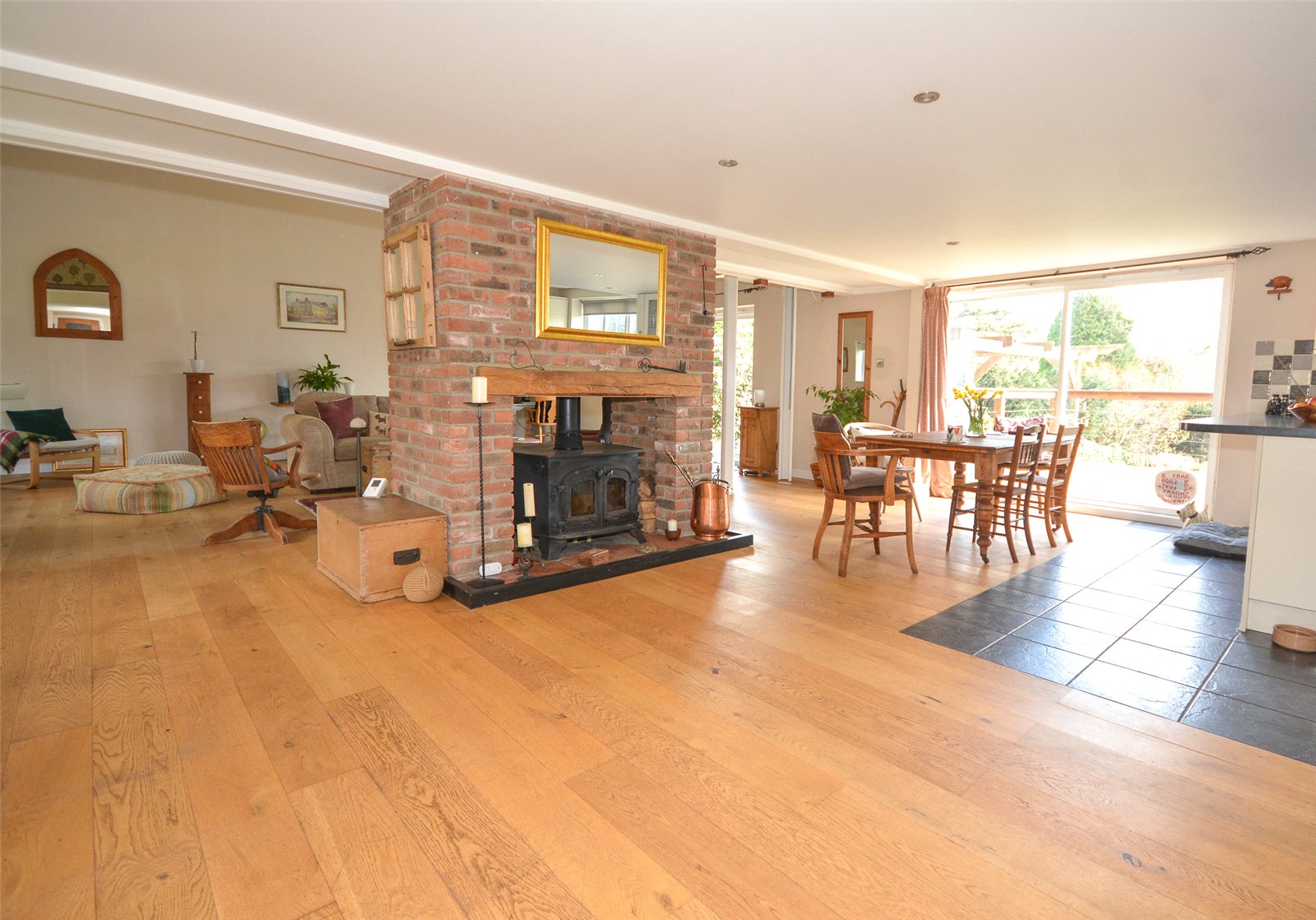 Large Dining Area : Oak flooring, wood burning stove with brick surround, storage cupboard, radiator and dual aspect with sliding patio door to wonderful raised sun deck with far reaching views to The South Downs. Wide openings either side lead into :
