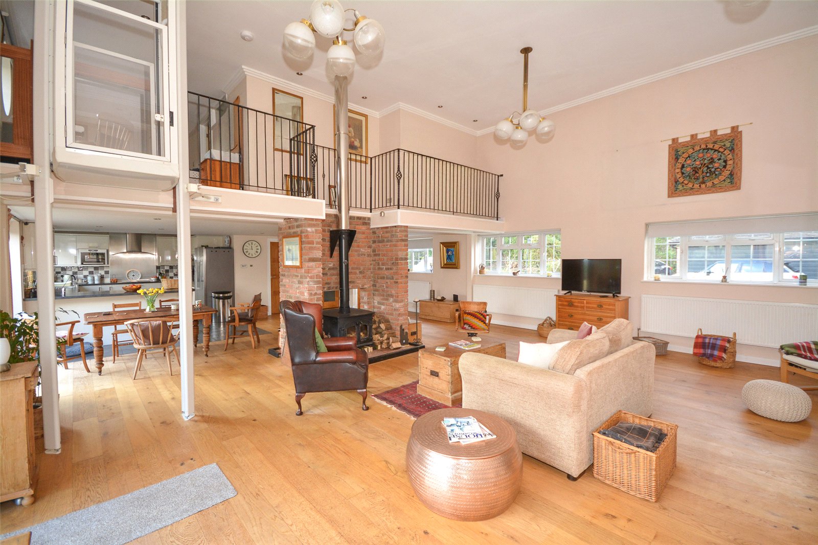 Vaulted Sitting Room : Formerly the private cinema area this fantastic vaulted space features an extensive wall surface for projection or artworks with a first floor gallery overlooking it. There is a wood burning stove with hearth, oak flooring, 3 radiators and a lift with access to the first floor. Sliding door to terrace and garden with steps and fine views towards The South Downs. This impressive vaulted space creates an ideal entertaining area but on the consent has planning for a principal bedroom suite above.