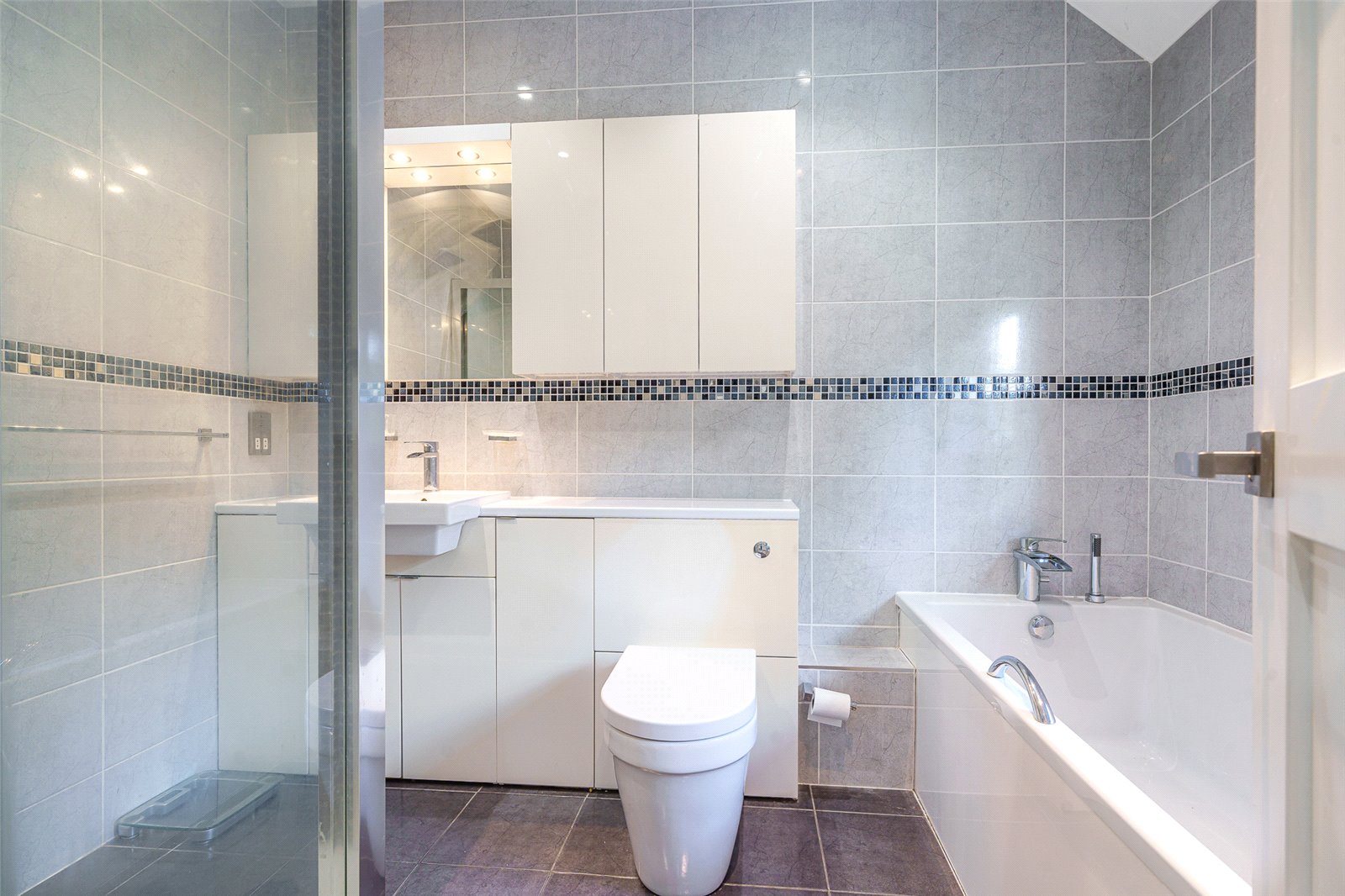 En-suite Bathroom : Comprising deep bath with waterfall tap, double shower enclosure, WC and vanity unit with wash hand basin and cupboards. Chrome ladder radiator, tiled floor and walls.