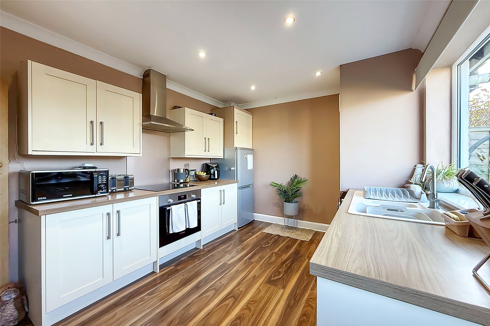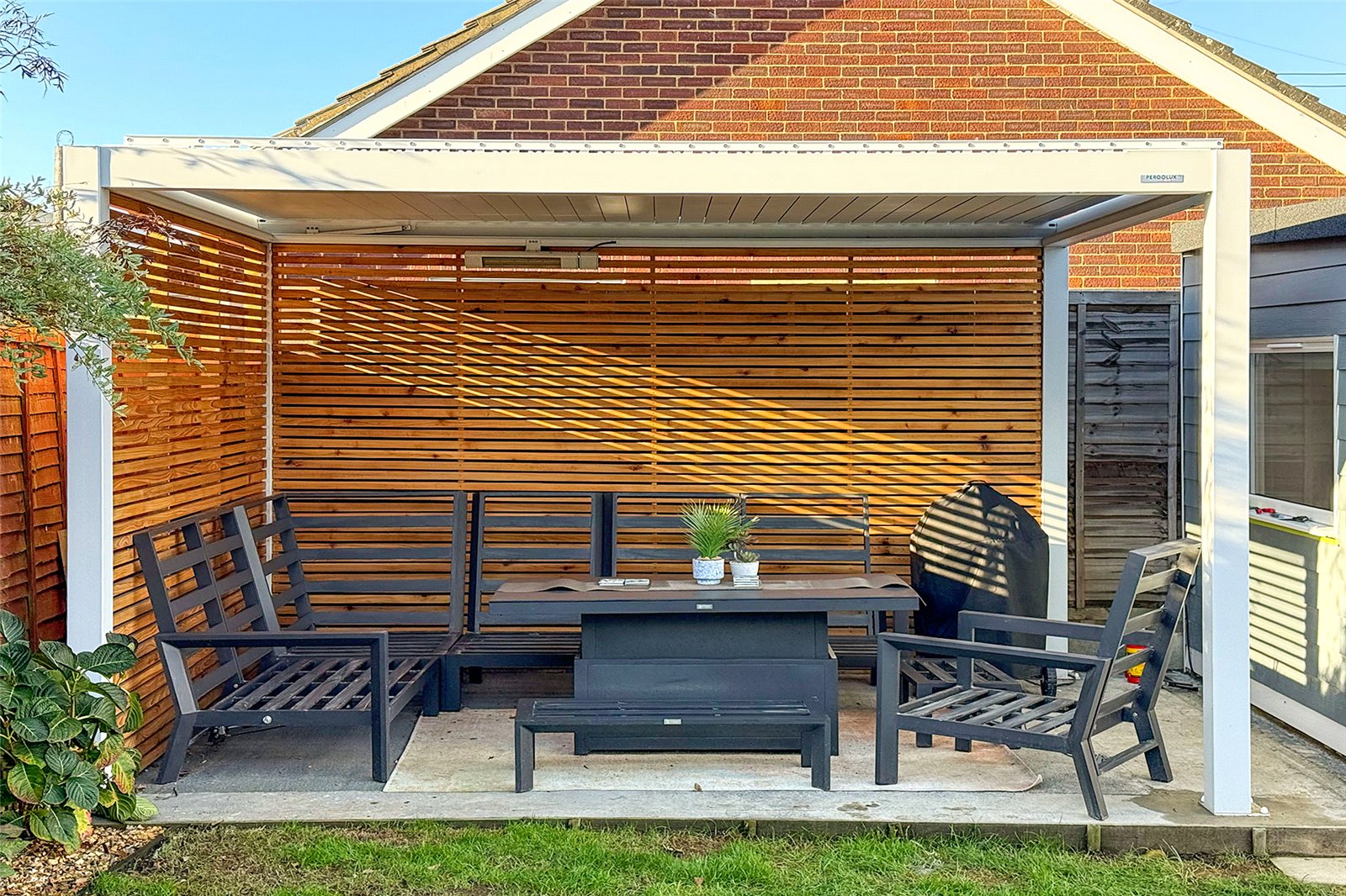 This beautifully presented two double bedroom detached bungalow is perfectly designed for comfortable and convenient living, with SCOPE TO EXTEND to the side (STPP)! Set back from the road, the property benefits from a private driveway to the front with space for a large vehicle, along with a newly added entrance porch offering handy built-in storage. Inside, a bright and generous living room sits to the front of the home, complete with a charming log burner; ideal for creating a cosy atmosphere all year-round. Both bedrooms are generous double rooms, with the main bedroom featuring impressive built-in wardrobes that provide excellent storage. The modern, re-fitted kitchen overlooks the rear garden and offers a stylish, practical space for cooking and entertaining. A well-appointed bathroom includes both a bath and an overhead shower. The rear garden is a real highlight; spacious, well-maintained, and perfect for those who enjoy outdoor living. It boasts a stunning electric pergola seating area with a heater, ideal for relaxing or entertaining in all seasons. Additional benefits include side access to the driveway, storage to the side of the property, and a versatile outbuilding that could be used as a gym, home office, playroom and more! With a PIV system bringing fresh air into the home, double glazing, gas central heating throughout and air-conditioning units in both bedrooms, this wonderful bungalow is warm, efficient and ready to move straight into. A must-see property!