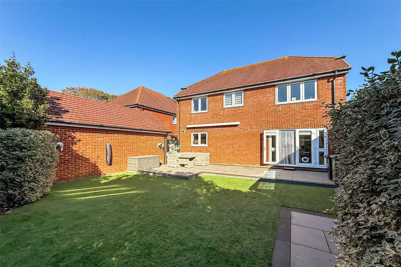 Tucked away in one of Kingley Gates most prestigious and peaceful cul-de-sacs, this beautifully presented double-fronted four-bedroom detached family home is a true standout. Offering spacious and flexible living throughout, the property is finished to a superb standard and is ready for its next owners to move straight in. Set back from the road, it boasts fantastic kerb appeal with a large driveway providing parking for at least two vehicles, as well as a garage complete with an electric roller door. Inside, several rooms upstairs enjoy magnificent views of the South Downs, the main bedroom features a modern en-suite shower room and built in wardrobes, there is a fully fitted ground floor study and the landscaped gardens to the front and rear have been designed with low maintenance in mind, with the rear garden enjoying a west-facing aspect and features a newly installed awning. Theres also side access and outdoor electric points, adding extra convenience. Situated just a short walk from the local convenience store and quietly positioned in a select development of only four homes, this property offers the perfect balance of seclusion and accessibility. Early viewing is highly recommended!