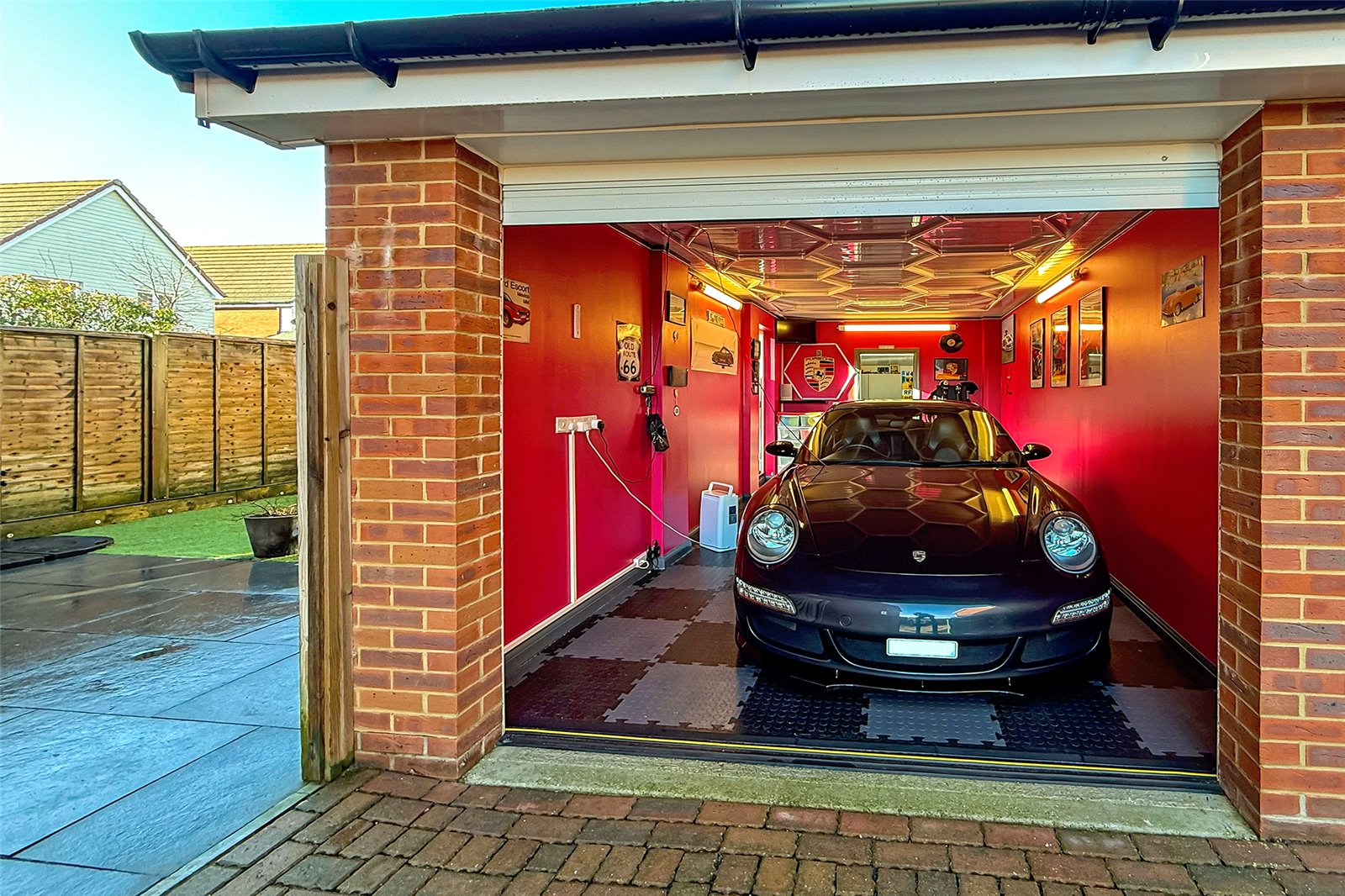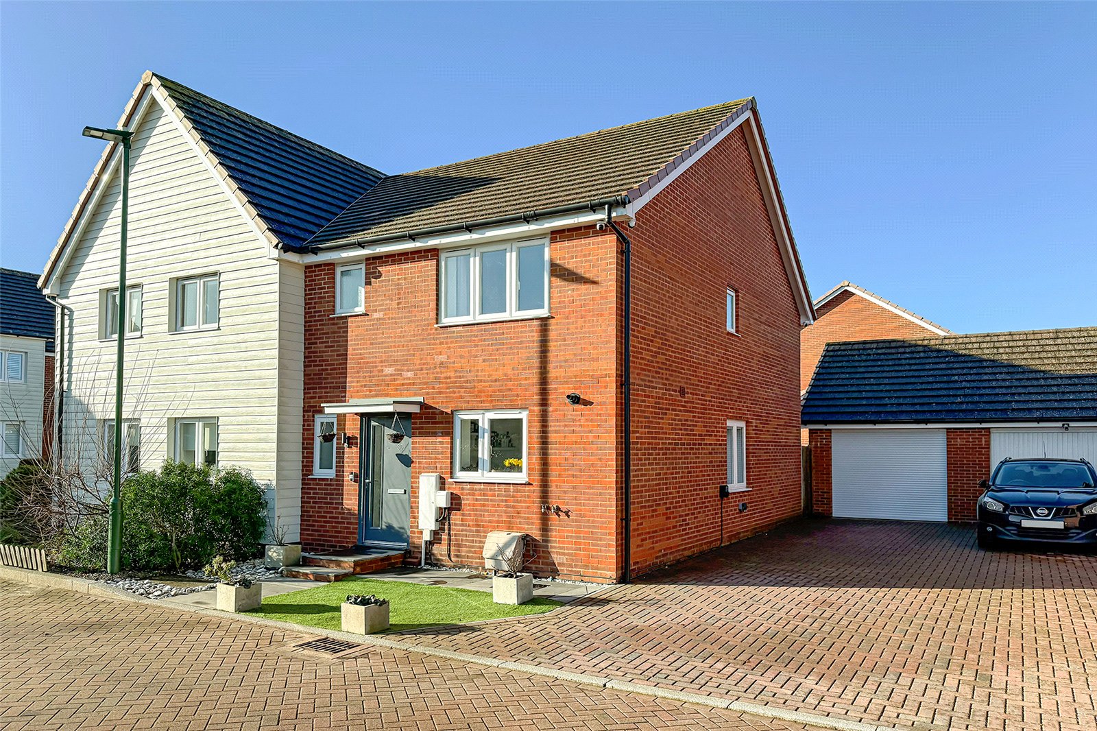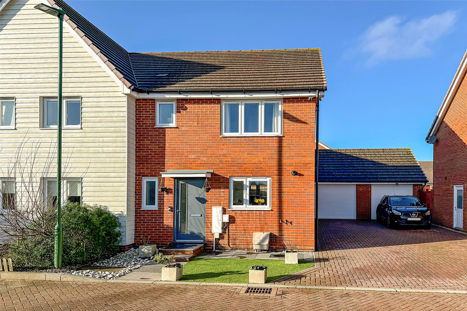 Tucked away from the road in a peaceful, sought-after position, this stylish three-bedroom semi-detached house is presented in show home condition throughout and offers the perfect blend of modern living, convenience and curb appeal. The ground floor features a welcoming cloakroom and an impressive open-plan living, dining and kitchen space, beautifully designed for both everyday living and entertaining. Double doors lead directly onto the private, landscaped, low-maintenance rear garden, creating a seamless indoor/outdoor flow ideal for summer evenings and social gatherings. From the garden, you can access the garage, which has been transformed into an exceptional workshop complete with an electric roller door, car charging point and direct access from the garden; perfect for hobbyists, creatives or those needing extra storage. Upstairs, youll find three generous bedrooms. The main bedroom boasts built-in wardrobes and a modern en-suite shower room. A further contemporary bathroom and loft access complete the upper floor. Additional highlights include double glazing, gas central heating, and a large driveway with space for up to three cars, providing fantastic parking options.