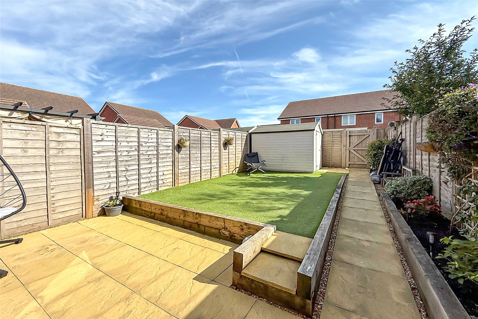 This stylish and modern three-bedroom terraced home offers beautifully presented living space, two allocated parking spaces right outside, and a stunning south-facing rear garden thats been thoughtfully landscaped for low-maintenance enjoyment. The garden features rear access, artificial lawn, a patio seating area perfect for summer evenings, and a handy storage shed. Inside, the home impresses with a spacious open-plan living/dining area, complete with a sleek media wall and double patio doors that bring the outside in. The contemporary fitted kitchen includes integrated appliances and flows seamlessly from the main living/dining space. A ground floor cloakroom adds convenience, while upstairs you'll find three well-proportioned bedrooms, including a main bedroom with en-suite shower room and built-in wardrobes. A modern family bathroom, gas central heating, and double glazing throughout complete the property. This is a fantastic opportunity to secure a turn-key home in a great location! Viewing is highly recommended!