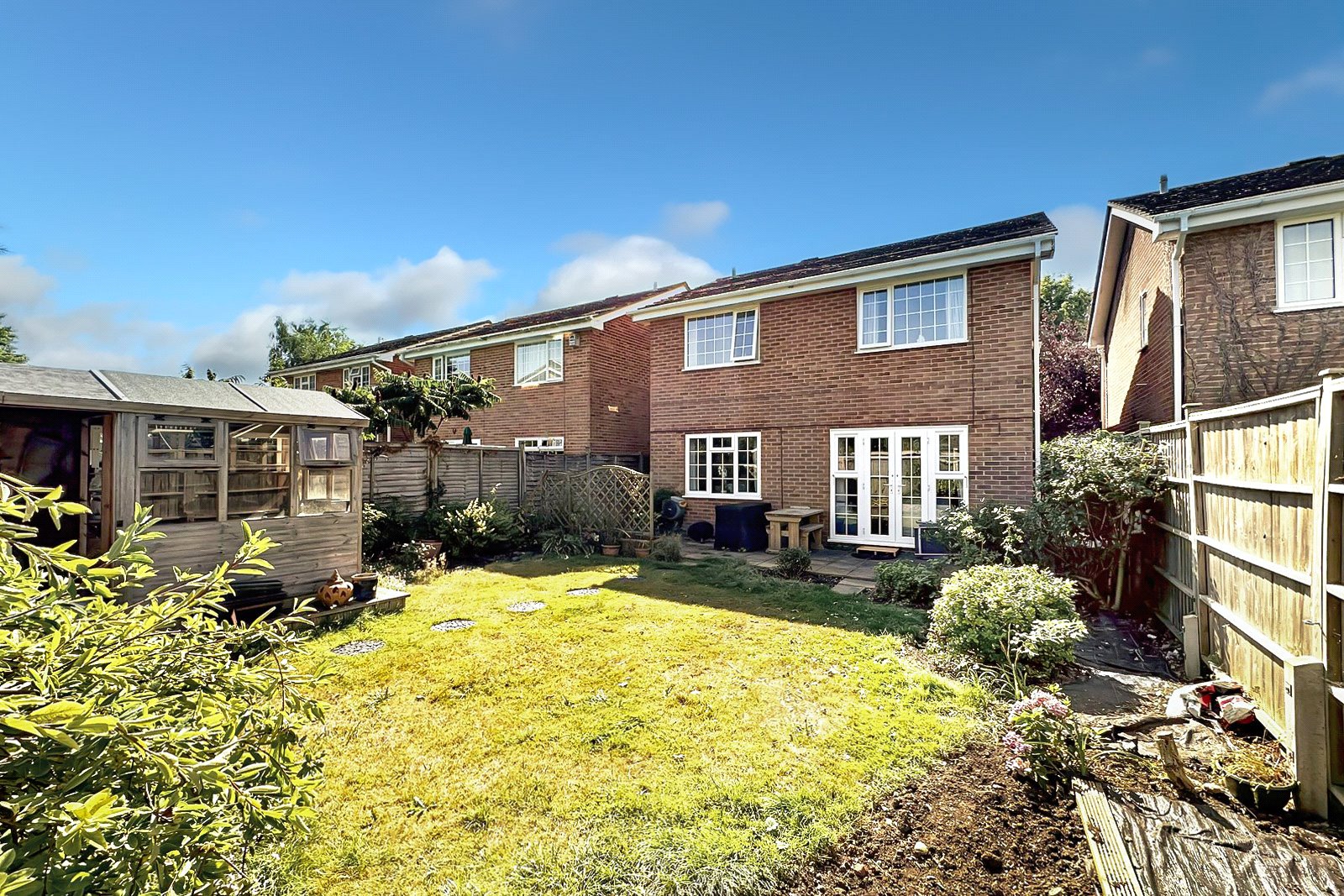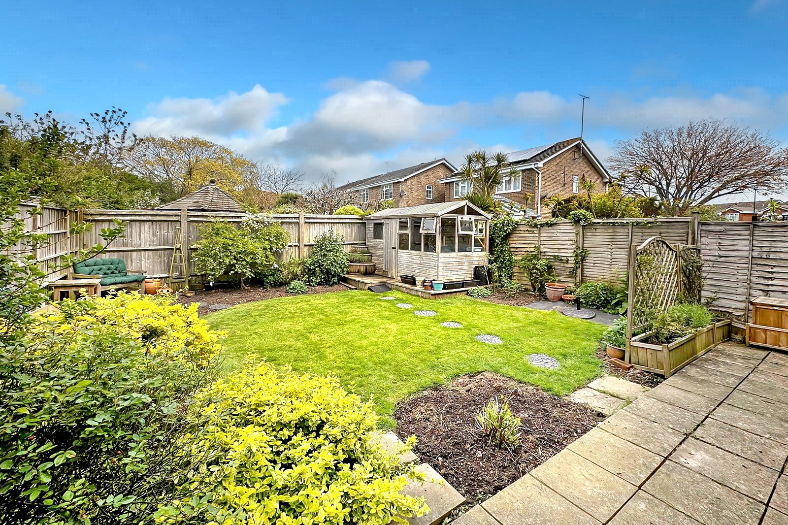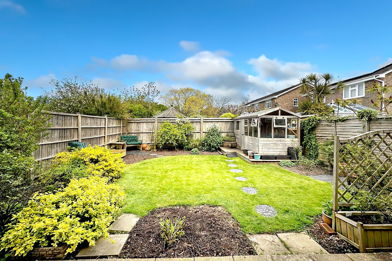Outside, the rear garden is secluded, with mature borders and a storage shed. To the front is a driveway and a nice size front lawn.