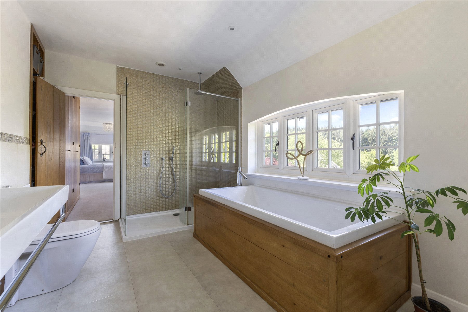 Upstairs, the principal bedroom suite is a private haven of indulgence, complete with its own balcony overlooking the gardens and countryside beyond. A spacious dressing area and luxurious en-suite bathroom, finished with contemporary fixtures, walk-in shower, and freestanding bath, elevate the everyday into something extraordinary. Four additional generously proportioned bedrooms provide excellent accommodation for family members or guests, each beautifully presented and served by a stylish family bathroom and a separate modern shower room.