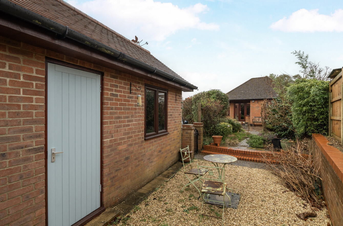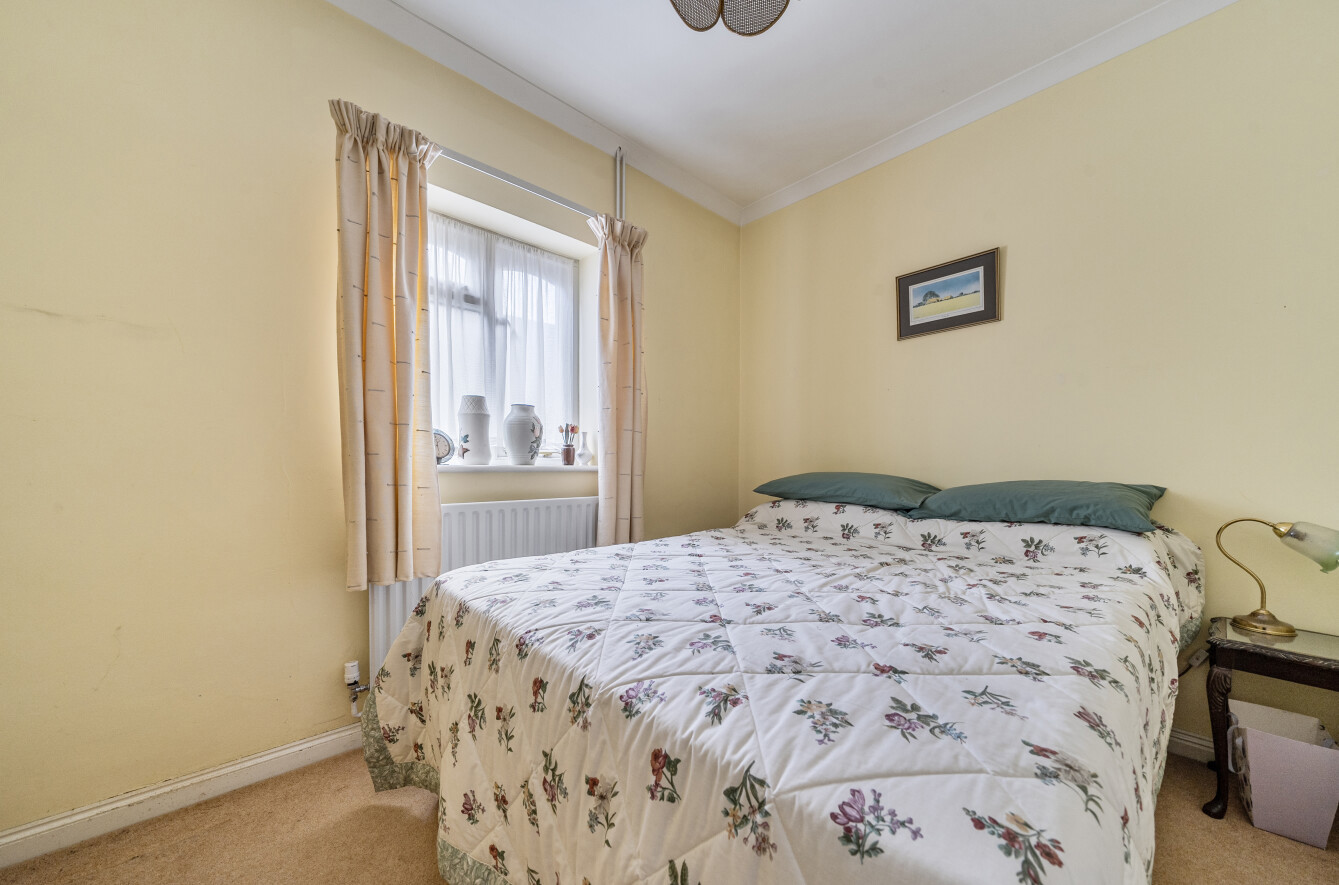 The bungalow further benefits from two well-proportioned double bedrooms. The principal bedroom enjoys a pleasant outlook over the rear garden and is complemented by an excellent range of built-in wardrobes. Both bedrooms share a notably spacious shower room, fitted with a contemporary shower cubicle alongside a classic pedestal wash basin and WC, all contributing to a calm and restful atmosphere.