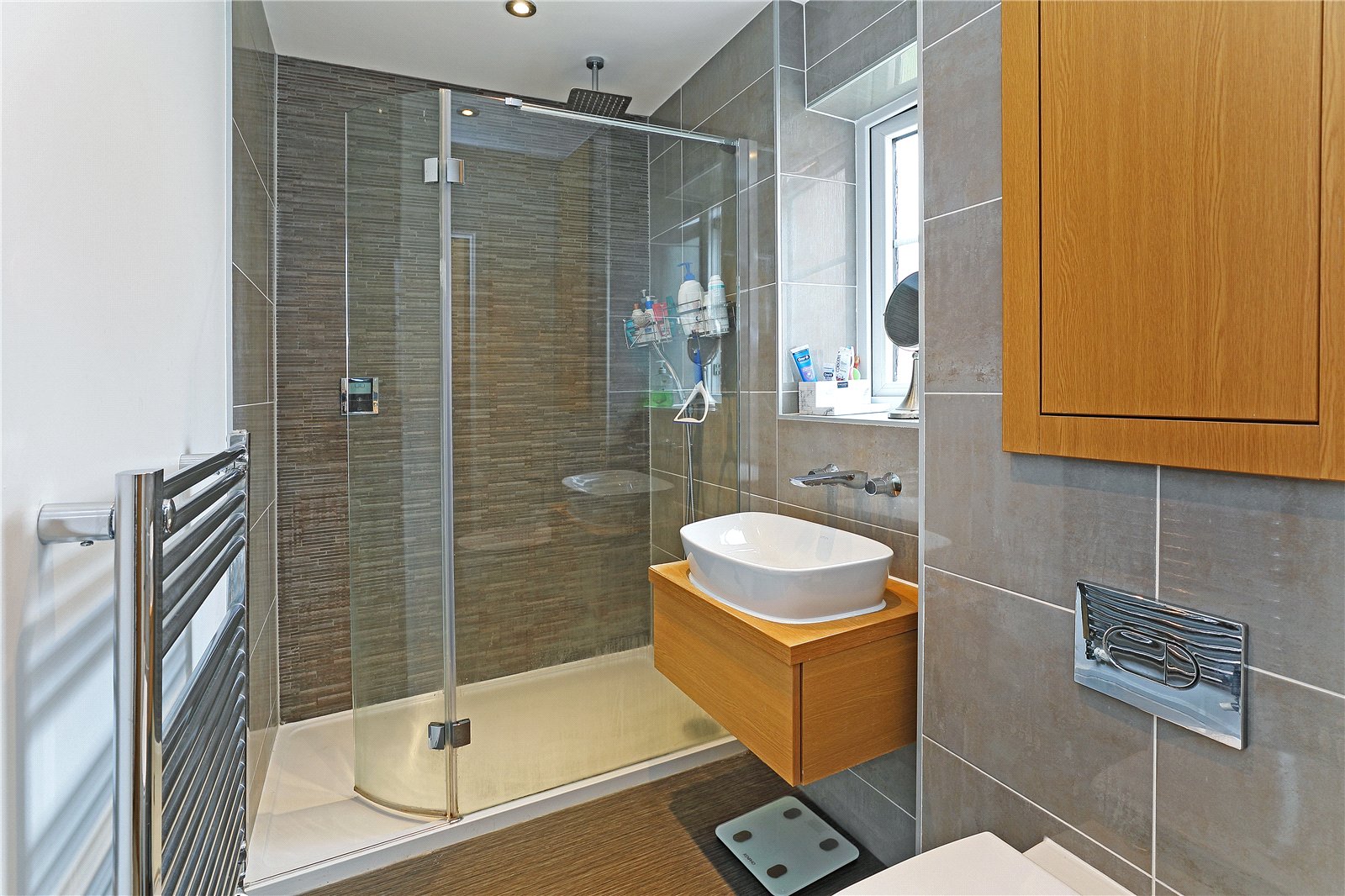 En-suite Shower Room Furnished with Scottini suite with wall hung wash hand basin, low flush w.c walk-in shower cubicle with rain dance shower head, fully tiled to the walls, concealed vanity cupboard, double glazed window, chrome heated towel rail.