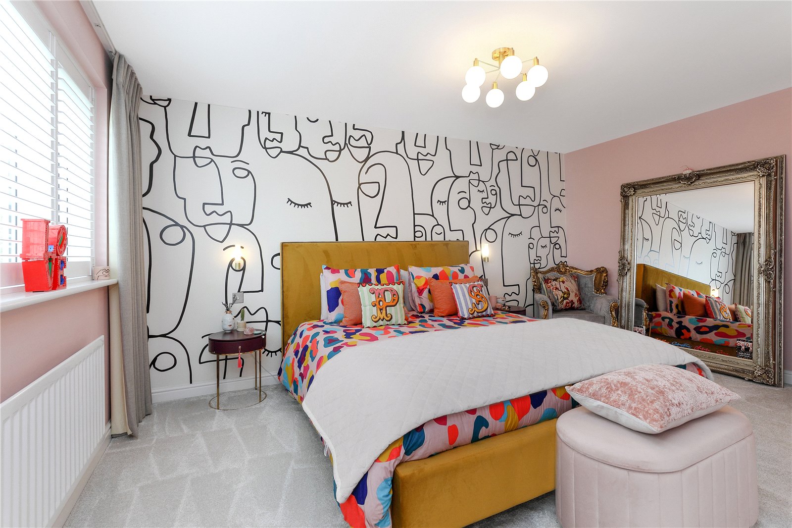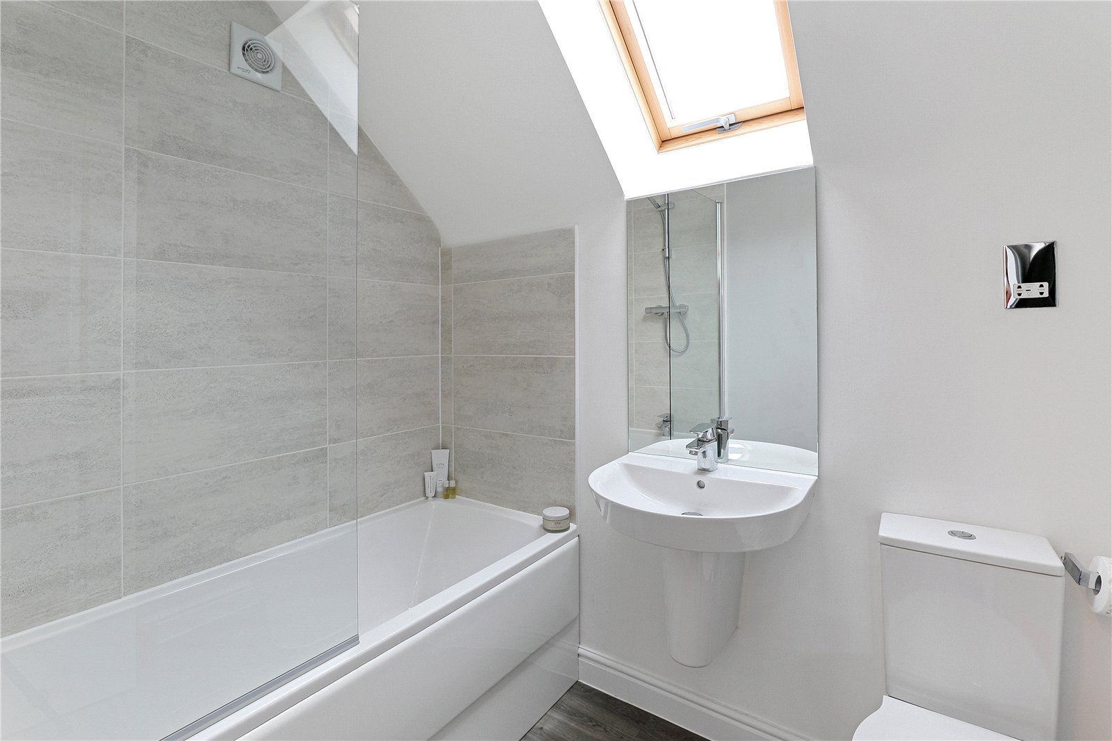 House Bathroom Furnished with modern white suite with wall hung wash hand basin, low flush w/c, panelled bath with shower over and shower screen, tiling, downlighting to the ceiling, electric shaver point, double glazed window, chrome heated towel rail.