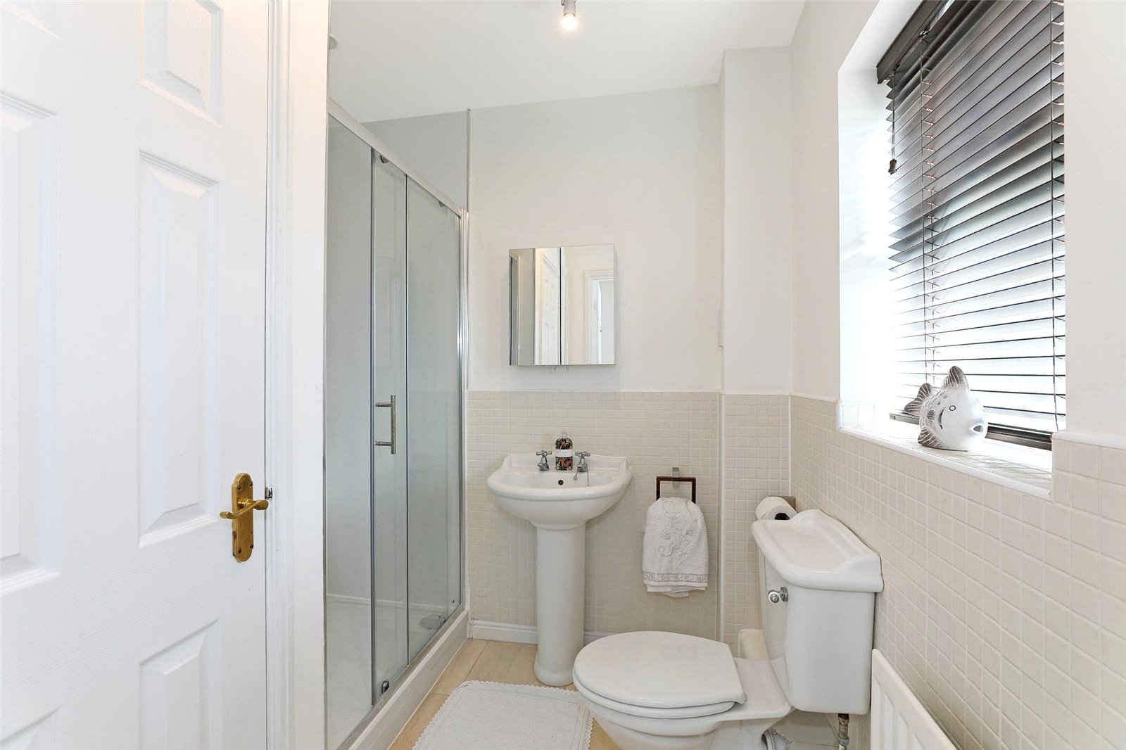 Ensuite Shower Room Furnished with modern white suite comprising pedestal wash basin, low flush w/c, shower cubicle, half tiling, double glazed window, single panel radiator, airing/cylinder cupboard.
