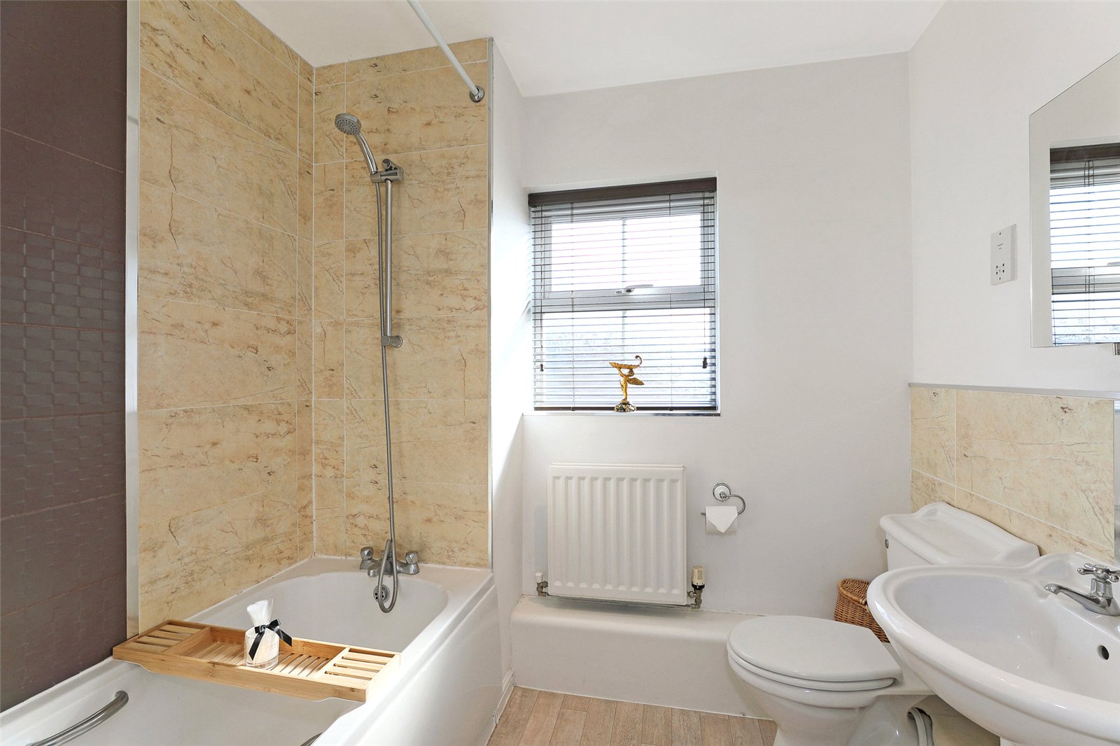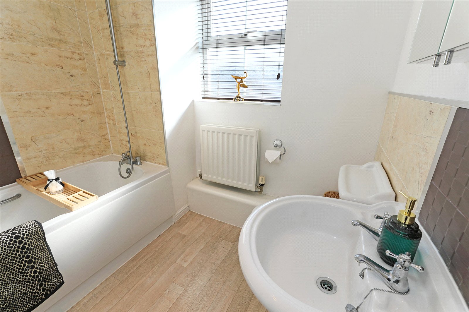House Bathroom Furnished with modern white suite comprising pedestal wash basin, low flush w/c, panelled bath with shower attachment and shower over, tiling, double panel radiator, double glazed window.