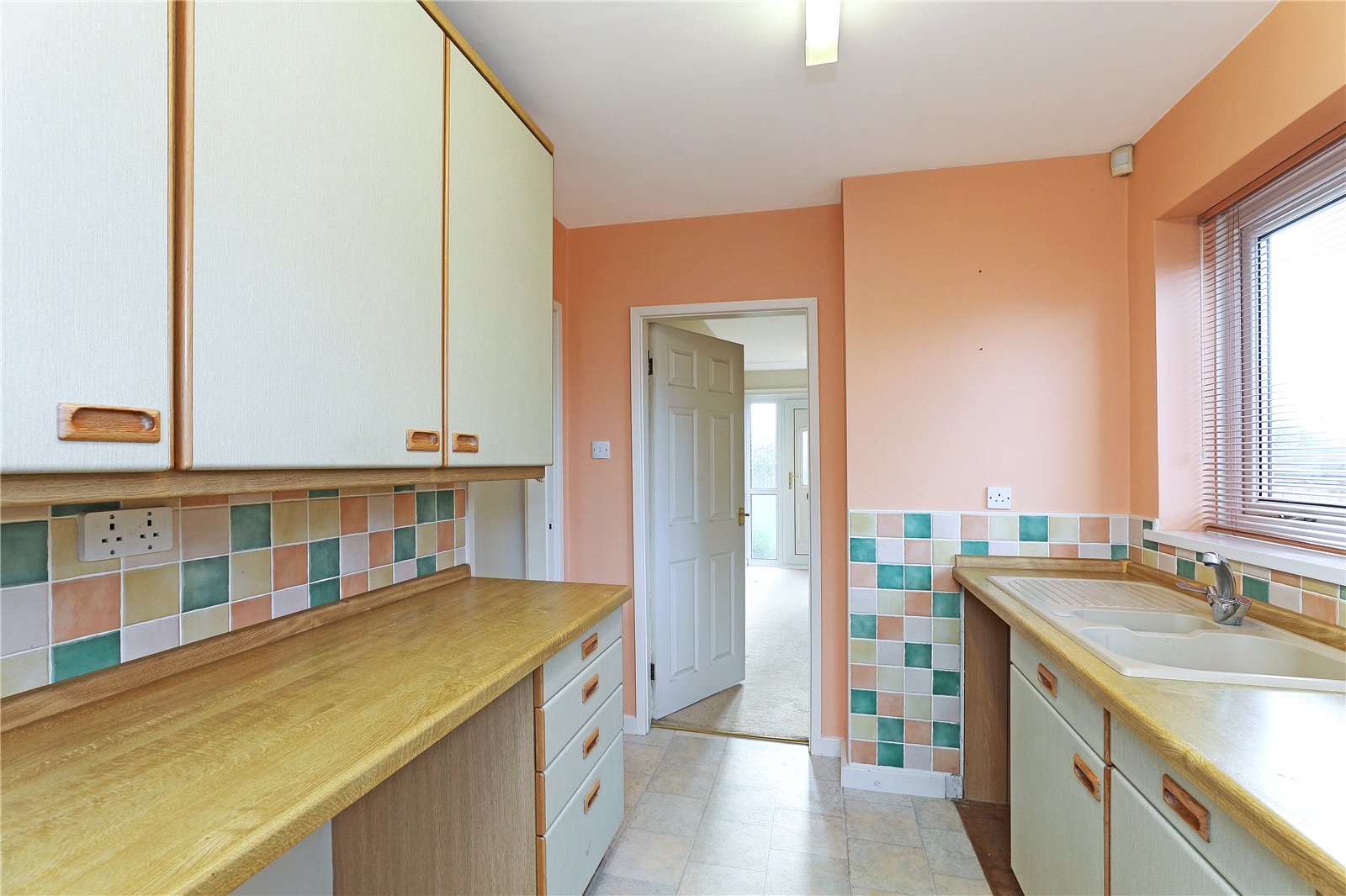Kitchen 10'5" x 7'5" (3.18m x 2.26m). Fitted with a matching range of oak trim wall and base units, contrasting worktop areas, contrasing worktop areas, colour coordinated sink unit, monobloc tap fitment, oven and hob, hot water boiler, plumbing for automatic washing machine, tiling between the worktops and wall units, two double glazed windows and rear entrance door.