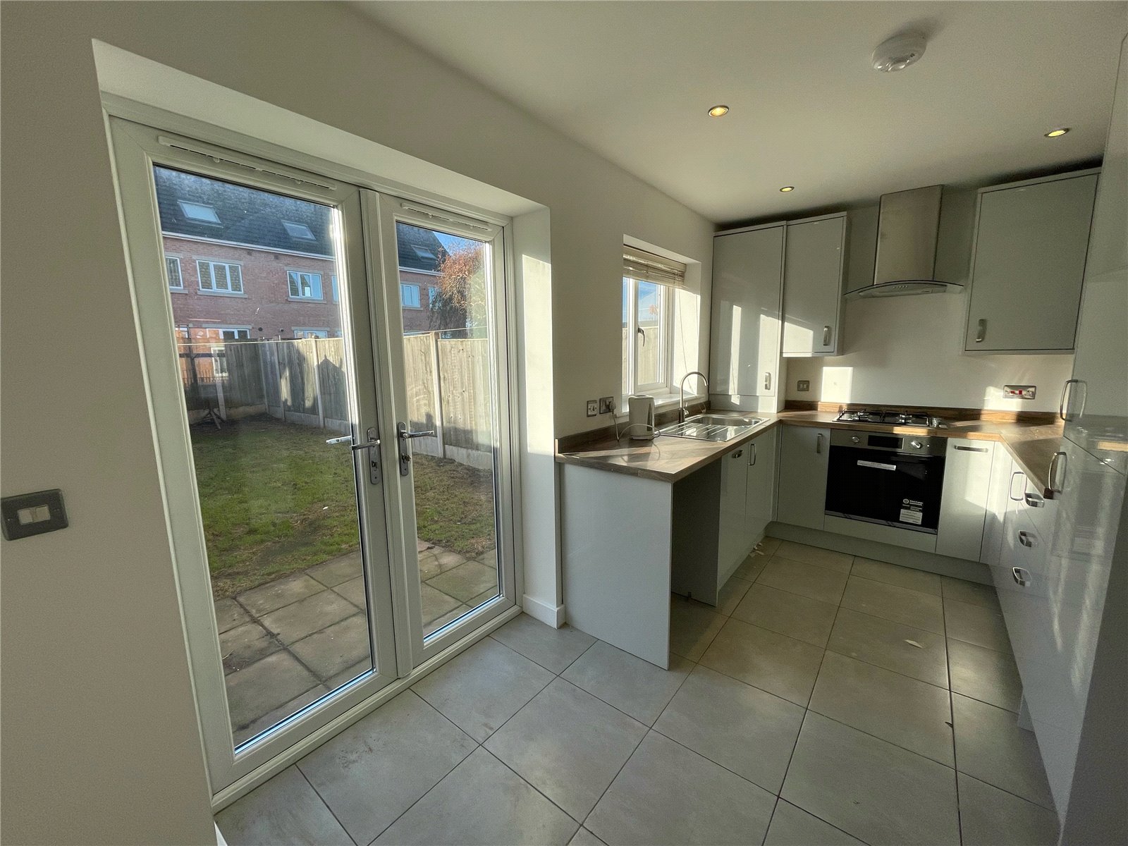 Kitchen/Diner 15'2" x 7'8" (4.62m x 2.34m). Fitted with a matching range of grey fronted wall and base units, contrasting worktop areas, stainless streel sink unt, single drainer with mixer tap unit, tiling to the floor, Ideal central heating boiler, plumbing for automatic washing machine, double glazed window and French doors leading onto the rear garden, central heating radiator.