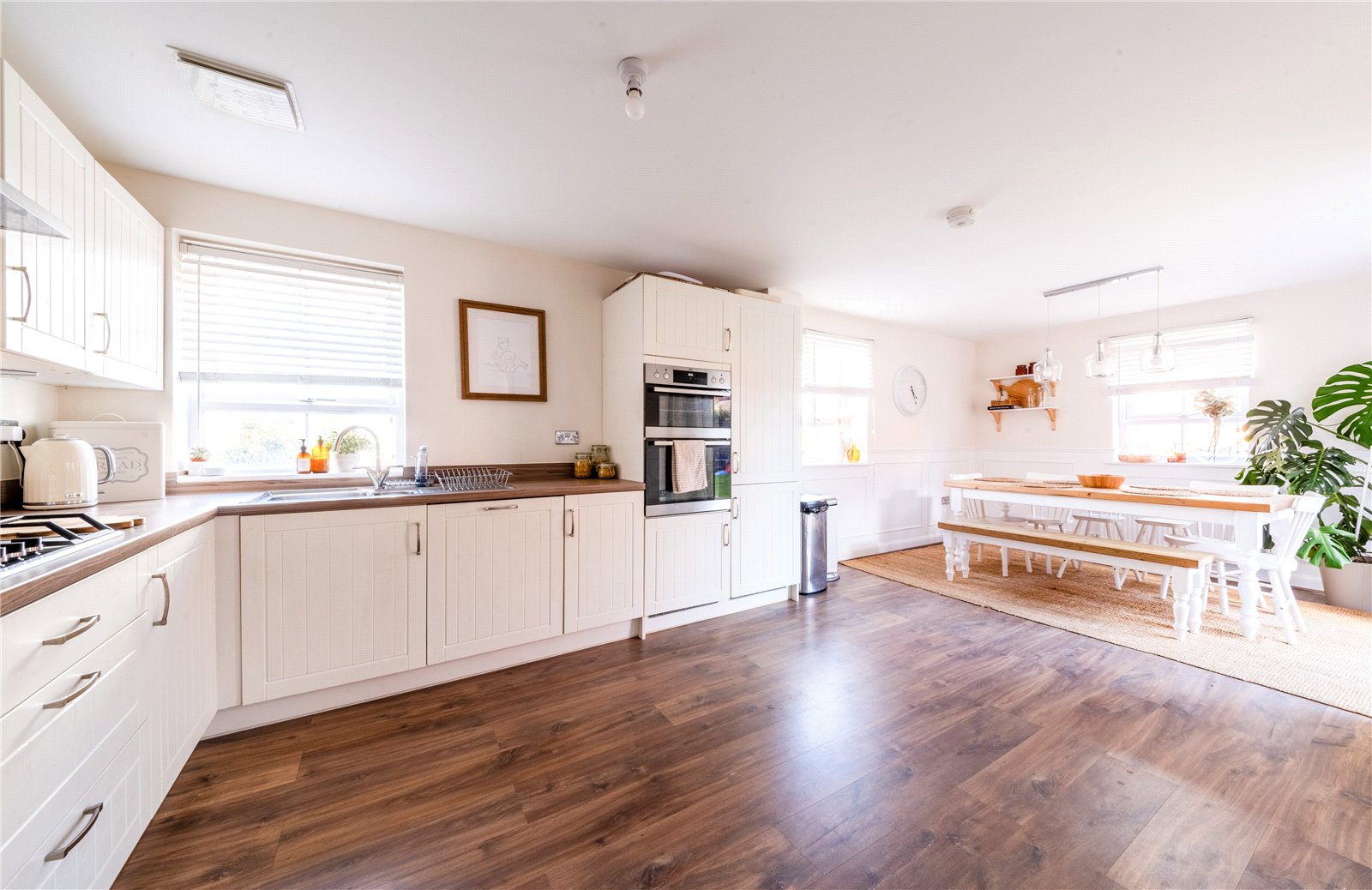 Upon entering the home, you are greeted by a welcoming hallway that leads to three main ground floor living spaces. To the front, the formal dining room features a bay window that fills the room with natural light, creating an ideal setting for family meals or entertaining guests. To the rear, a spacious sitting room spans the width of the house, complete with double doors opening onto the garden, perfect for relaxing or hosting in the summer. The modern kitchen/breakfast room is fitted with shaker-style cabinetry, sleek worktops, integrated appliances, and a gas hob, offering both style and functionality. A separate utility room provides added convenience, and a ground floor WC completes the layout.