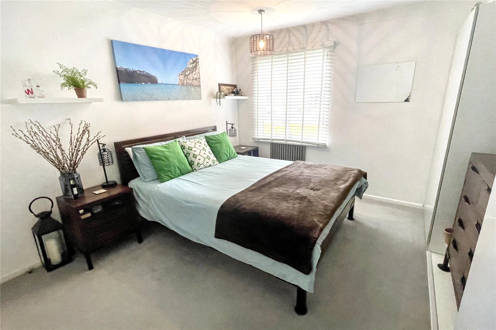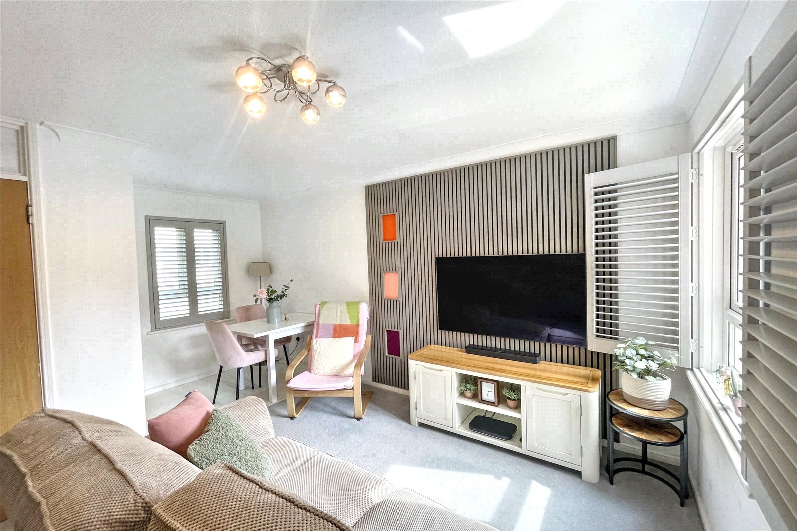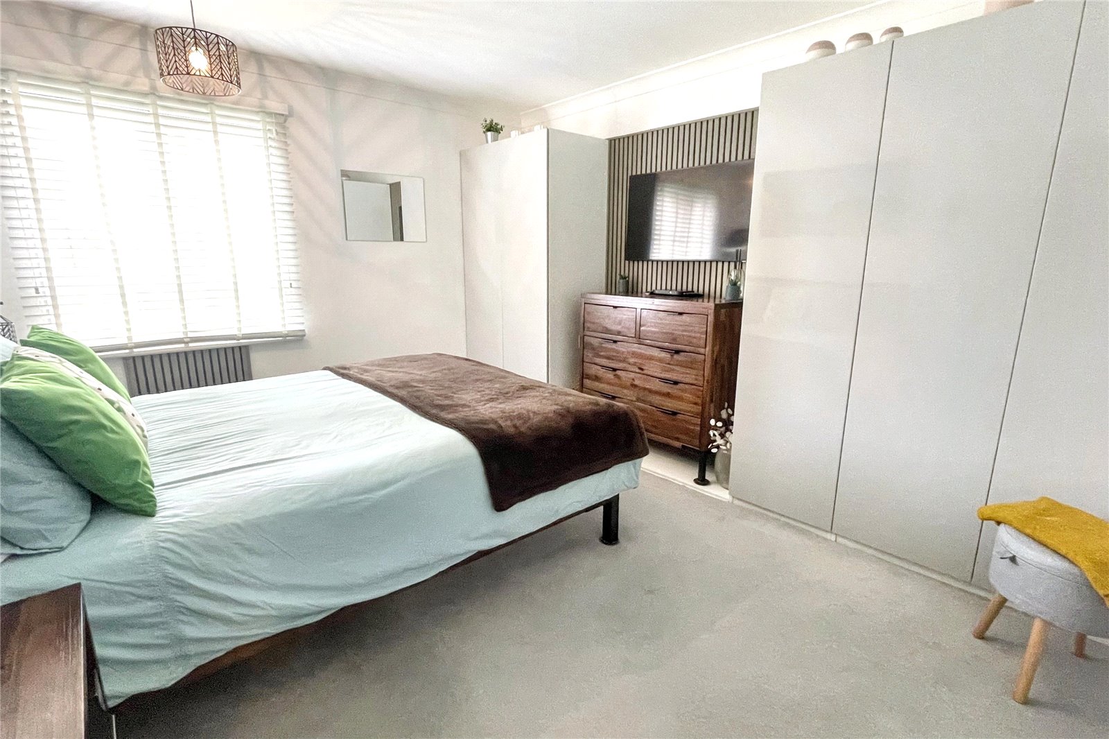 The property features two double bedrooms, including a spacious main bedroom with built-in storage and media wall, and a versatile second bedroom. A well-appointed recently fitted bathroom completes the interior.