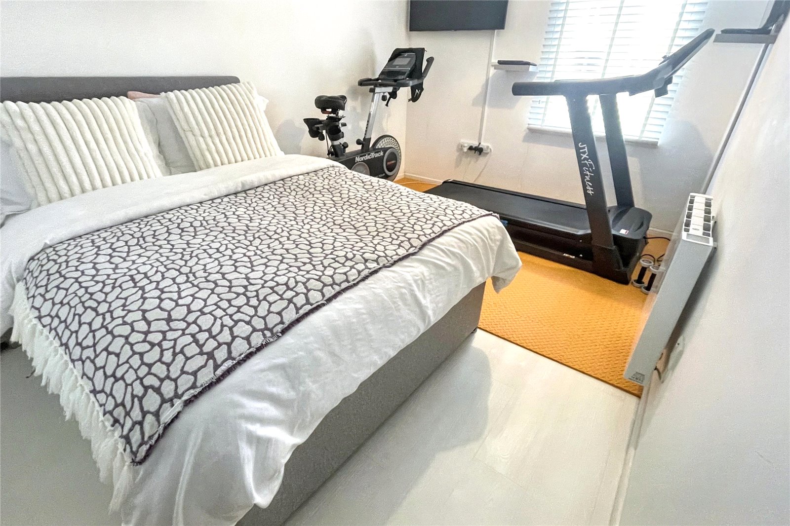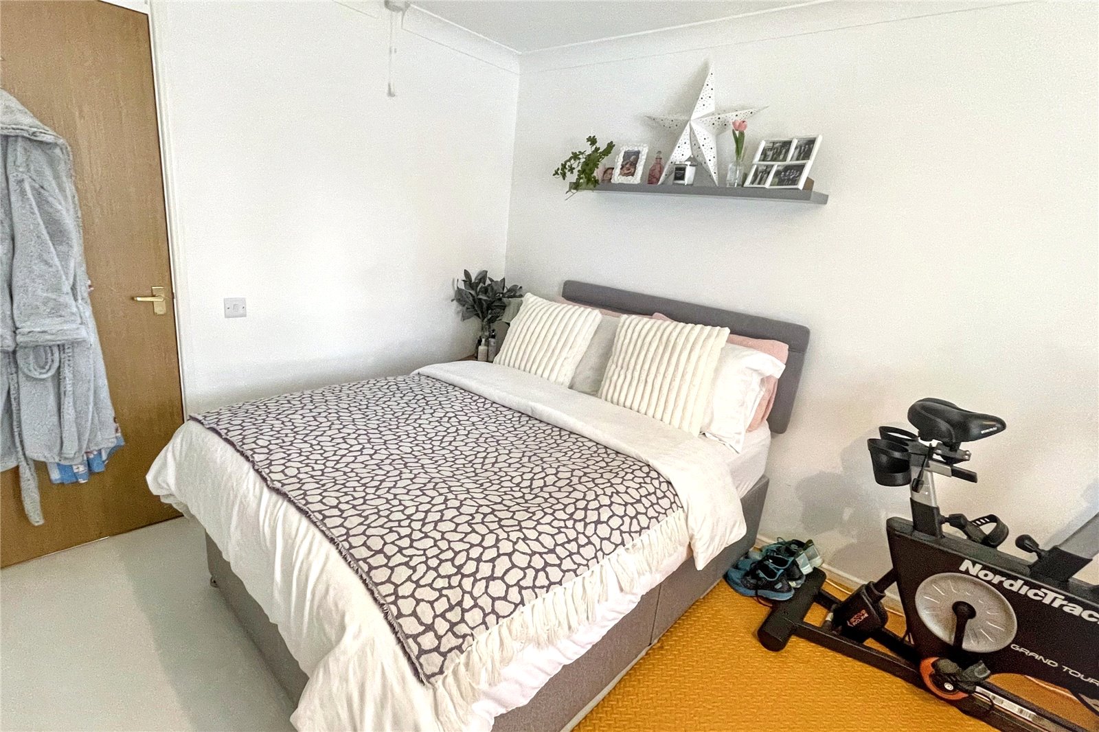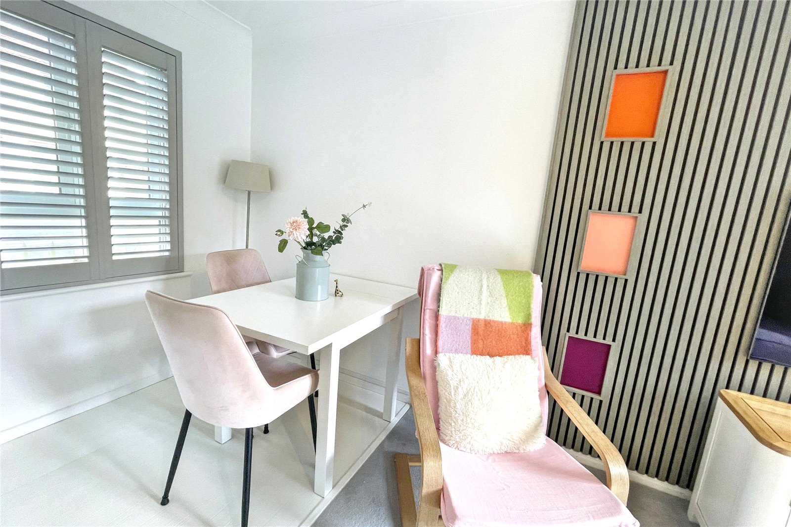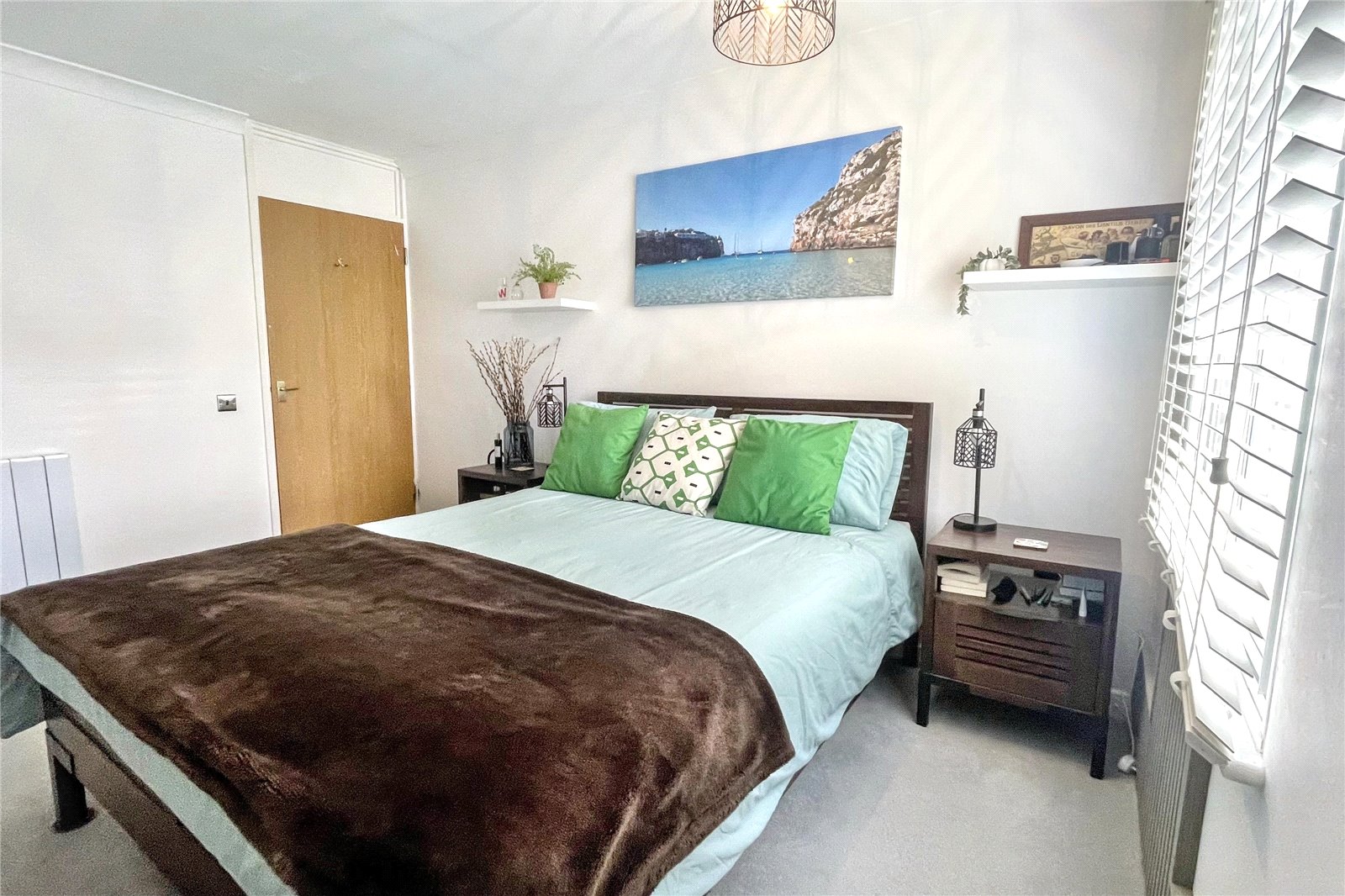 The property features two double bedrooms, including a spacious main bedroom with built-in storage and media wall, and a versatile second bedroom. A well-appointed recently fitted bathroom completes the interior.