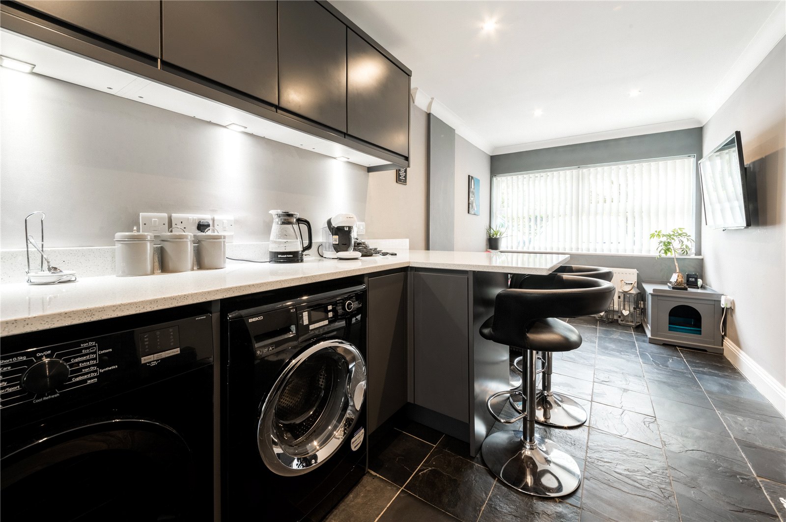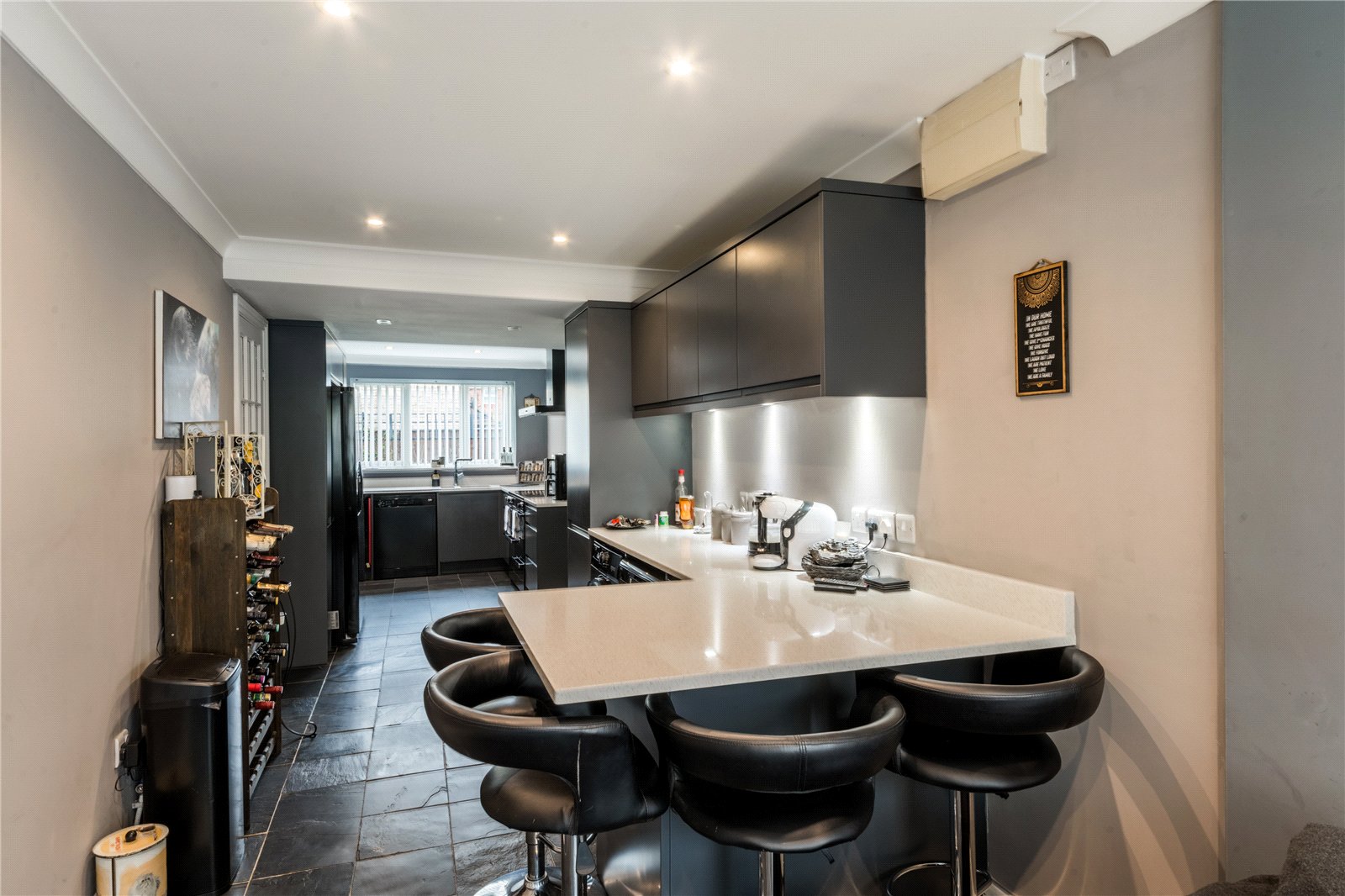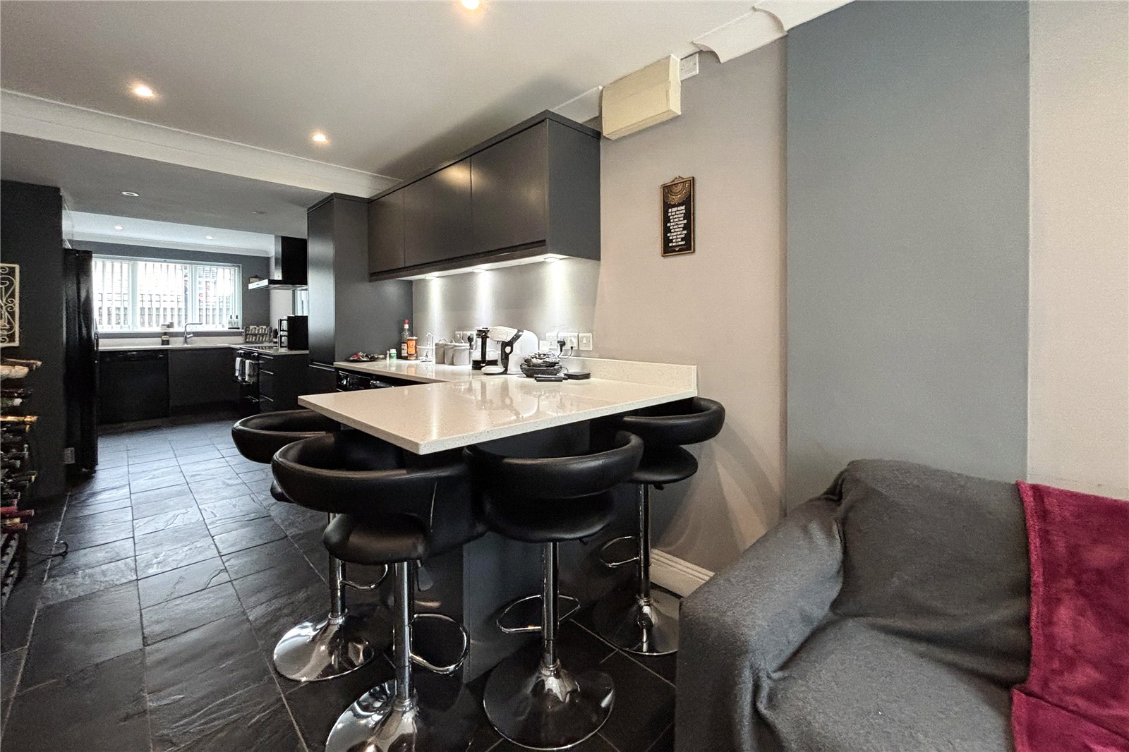 As you enter the property you are welcomed by a bright and airy hallway that leads onto the ground floor living space. A front room which is a very versatile space and can be used as a playroom, snug or office and includes a bay window. A large living room which is an ideal family space and perfect for entertaining or family evenings together. This leads onto the conservatory which is a brilliant space fitted with a wood burner meaning warmth through the winter months and French doors open up to the garden allowing for free flowing living in the summer. The modern kitchen which spans the length of the home includes plenty of worktop and storage space and allows for social living as there is a breakfast bar and space for a sofa and TV. There is also a downstairs W/C.