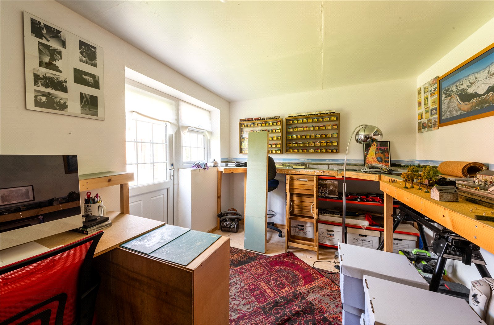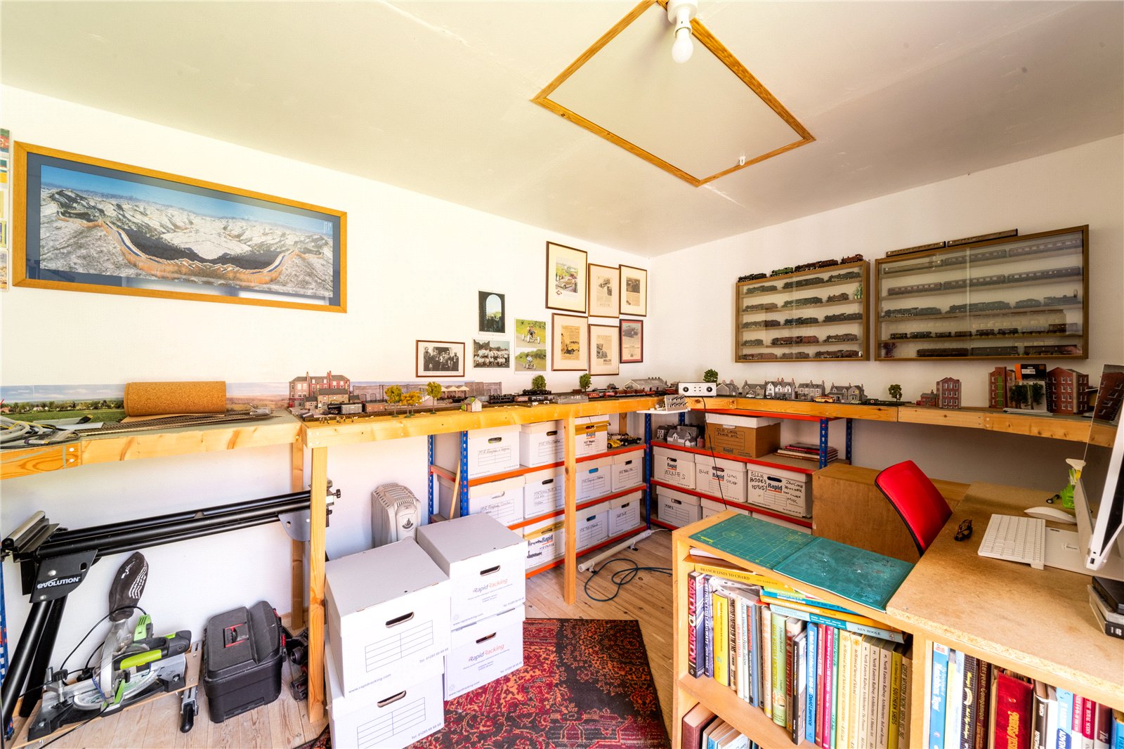 Externally there is a driveway with parking for multiple cars and a garage with electricity integrated and is currently used as an office/workshop. The sunny private garden provides a great space for BBQs or for playing with the family or pets.