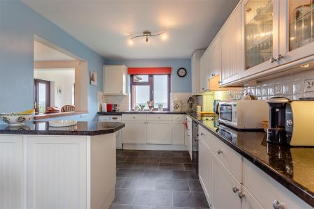 Kitchen / Breakfast Room - 6.17m x 2.74m (20'3 x 9'0) - One and a half bowl single drainer sink unit with mixer tap, cupboards under, range of base and wall mounted units, built-in electric oven and grill, four ring hob over, cooker hood above, integrated fridge / freezer, integrated dishwasher, plumbing for washing machine, breakfast bar, two double radiators, large open serving hatch to the dining room, cupboard housing the gas-fired central heating and domestic hot water boiler (fitted in 2018), rear aspect window with a southerly facing aspect and a superb outlook, front aspect window overlooking the gardens, part glazed frosted UPVC door through to the side.