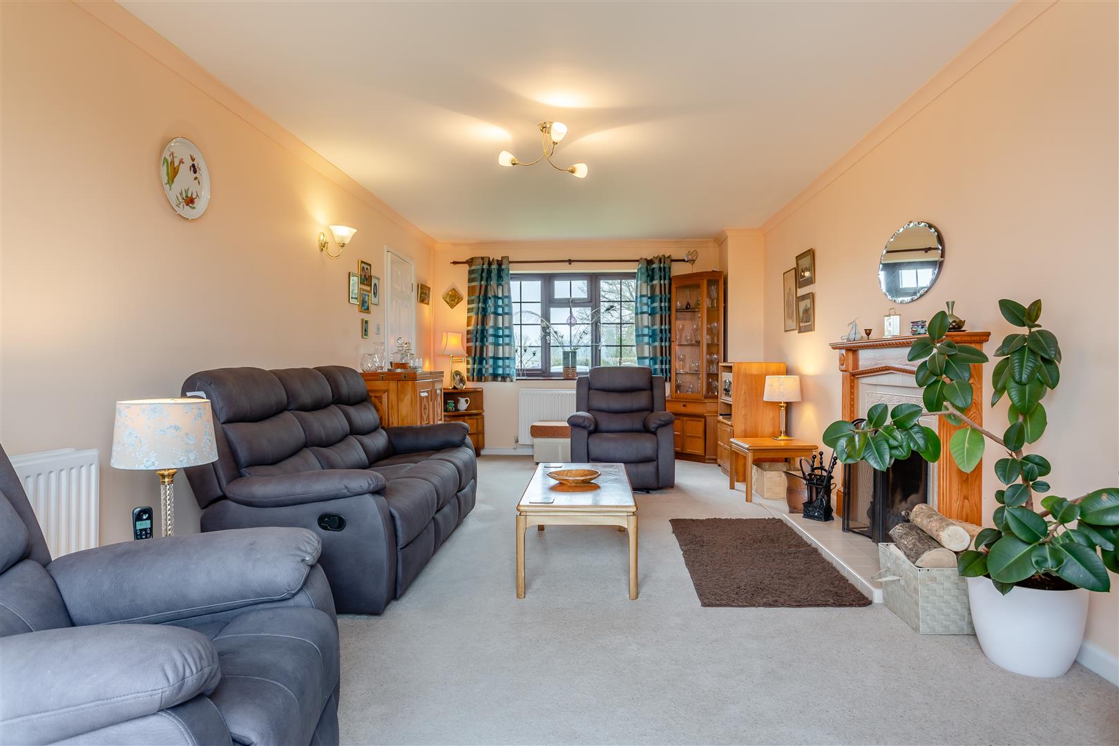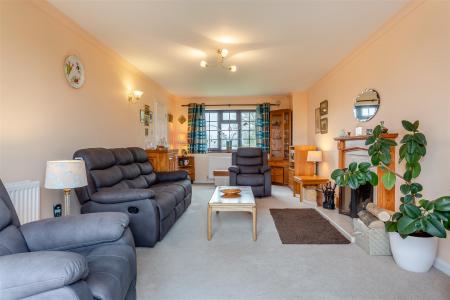 Living Room - 7.11m x 3.48m (23'4 x 11'5) - Open fireplace with raised tiled hearth, wooden surround, two double radiators, front aspect window with a private outlook, double glazed sliding patio doors through to the southerly facing rear garden, having a superb unspoilt outlook over surrounding fields and farmland.