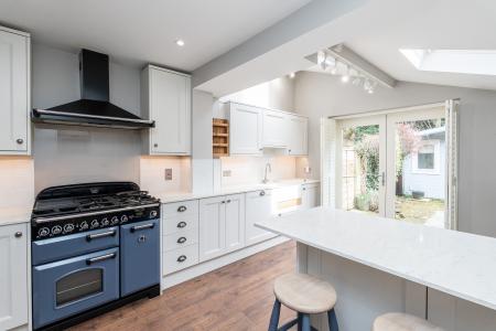The beautifully presented accommodation consists of a cosy yet bright front aspect sitting room with oak stripped flooring, feature fireplace with an open fire. The impressive sized open plan kitchen/diner has been updated recently with a full range of fitted units, work tops and space for all appliances with plenty of room for a large dining table and chairs. This is a lovely bright room, thanks to the skylight windows and glass doors opening directly out to the garden.