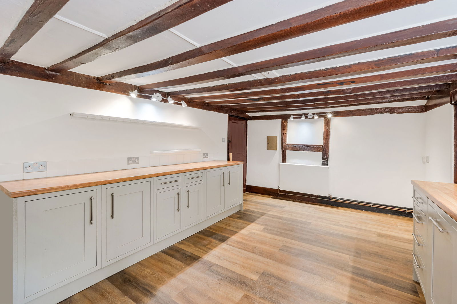 -Kitchen/Breakfast Room - range of classic style units with work surfaces, cupboards and drawers below, inset deep Butler’s sink. Recess with Beko range oven, timber effect laminated flooring, door to garden, door to utility room
