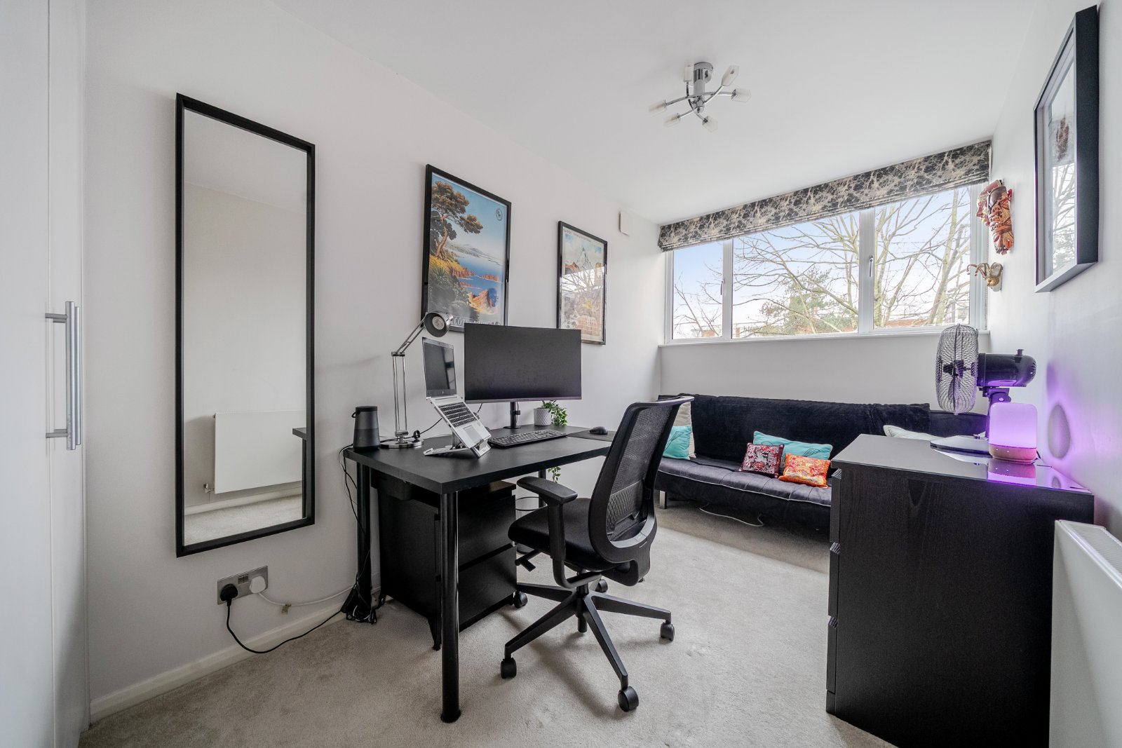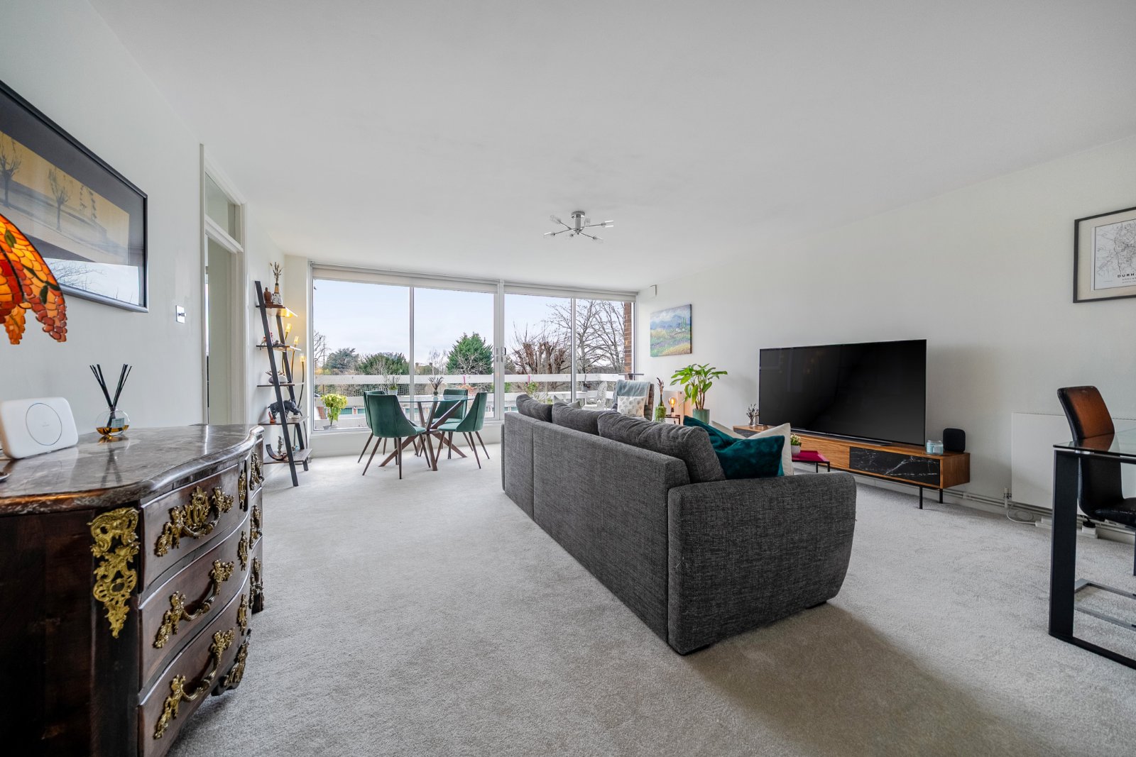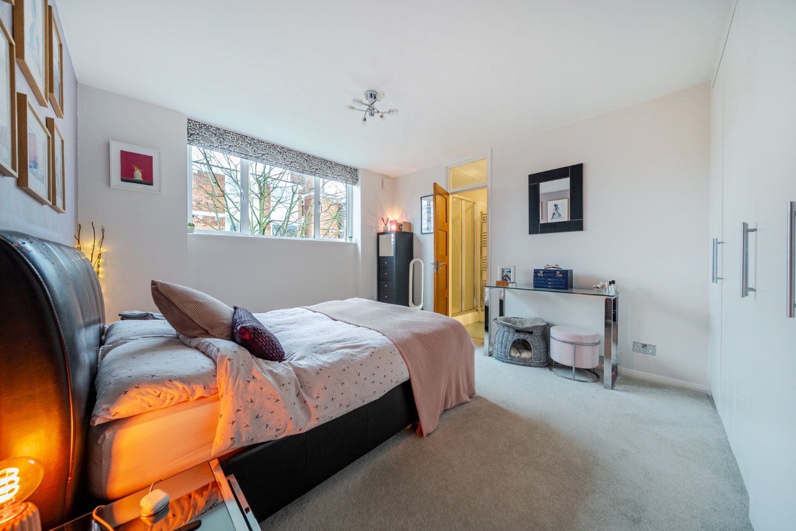 The spacious accommodation, measuring close to 1,000 sq ft and finished with new carpets throughout, briefly comprises a generous entrance hall, two well-proportioned double bedrooms, and a bright and airy living space. The principal bedroom features fitted wardrobes and a modern ensuite shower room with WC and chrome heated towel rail, while the second bedroom, also a comfortable double, benefits from fitted wardrobes.