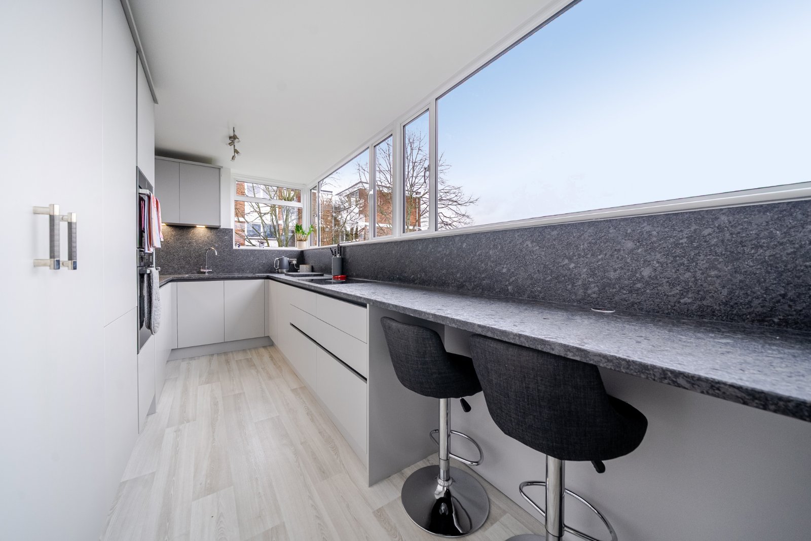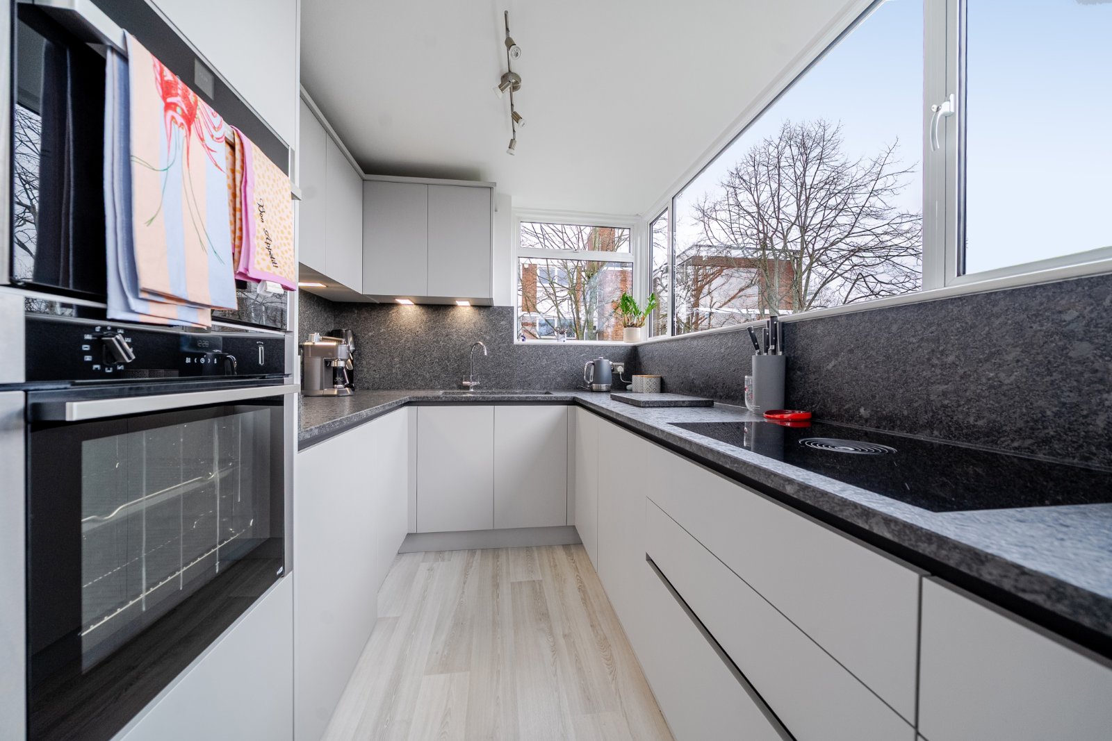 The well-appointed kitchen, installed in 2021, is fitted with high-quality units, granite worktops, and a beautiful larder cupboard. Integrated appliances include a Bora hob, Neff oven and microwave, large fridge freezer, dishwasher, and washing machine. A striking full-width panoramic window creates a wonderful focal point and fills the room with natural light.