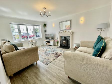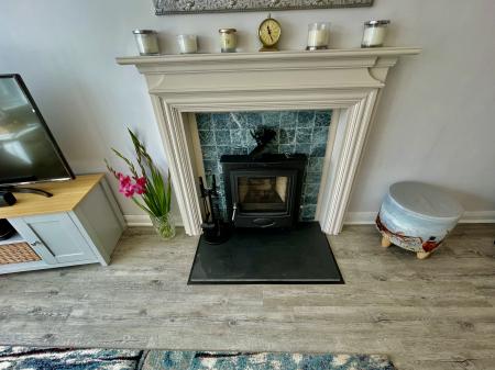 LOUNGE 11' 8" x 16' 11" (3.56m x 5.17m) UPVC double glazed bay window to the front elevation, skimmed and coved ceiling, centre light point, 2 fitted wall lights, laminate plank effect flooring, electric storage heater, TV point, feature wooden fireplace with tiled insert and slate hearth with fitted multi fuel burning stove.
