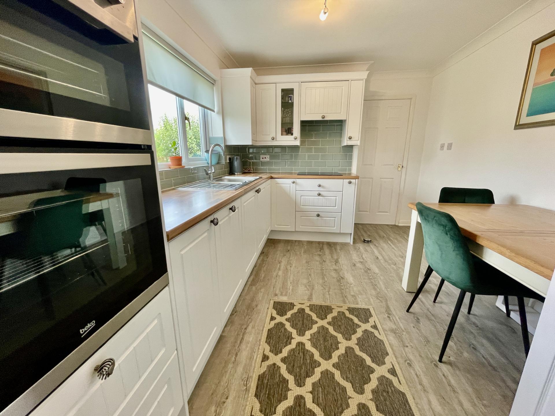 KITCHEN DINER 9' 8" x 12' 7" (2.97m x 3.86m) UPVC double glazed window to the rear elevation, skimmed and coved ceiling, centre spotlight fitment, laminate vinyl plank flooring, electric storage heaters, fitted with a wide range of base and eye level units, work surfaces over, tiled splashbacks, inset one and a quarter bowl stainless steel sink with mixer tap, integrated Beko induction hob, integrated eye level Beko double fan assisted electric oven, integrated slim line Beko dishwasher, further drawer and glazed units, TV point, door into:
