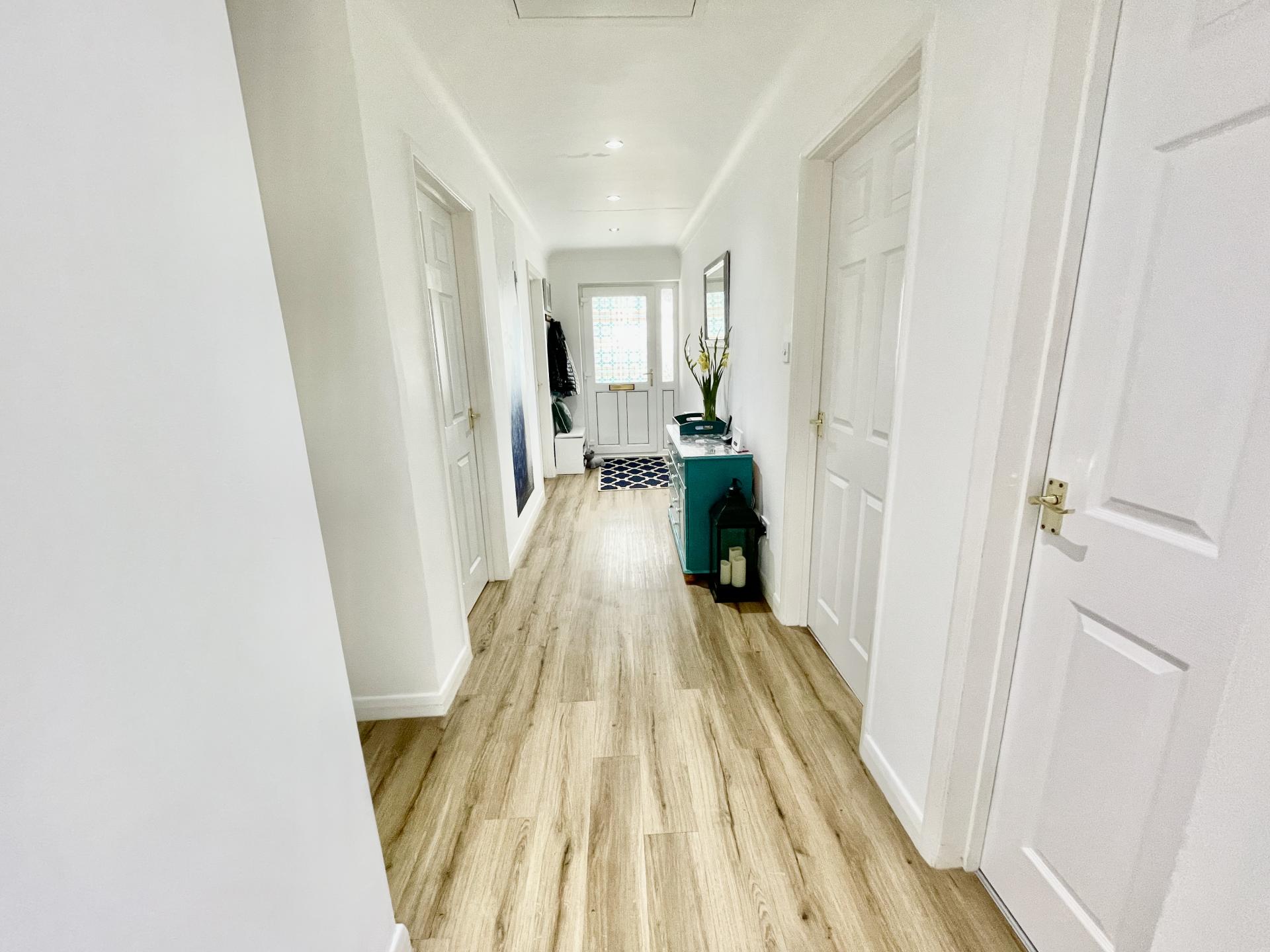 ENTRANCE HALLWAY 4' 11" widening to 6'6'' x 20' 1" (1.5m widening to 2.0m x 6.13m) Skimmed and coved ceiling, inset LED lighting, access to part boarded loft space with pull down ladder and light, plank effect laminate flooring, telephone point, electric storage heater, storage cupboard off housing hot water cylinder with slatted shelving, door into: