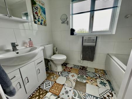 FAMILY BATHROOM 5' 5" x 8' 0" (1.66m x 2.45m) Obscured UPVC double glazed window to the rear elevation, coved and textured ceiling, centre light point, extractor fan, shaver point, mosaic tiled flooring, stainless steel heated towel rail, fitted with a three piece suite comprising low level WC, wash hand basin with mixer tap fitted into vanity unit with storage below and medicine cabinet over, bath with thermostatic tap and fitted shower attachment over and shower screen.