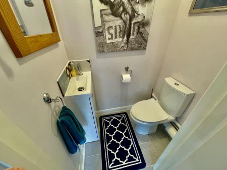 CLOAKROOM 2' 11" x 4' 2" (0.89m x 1.28m) Coved and textured ceiling, centre light point, tiled flooring, fitted with a two piece suite comprising low level WC and wash hand basin with mixer tap fitted into vanity unit with storage below.