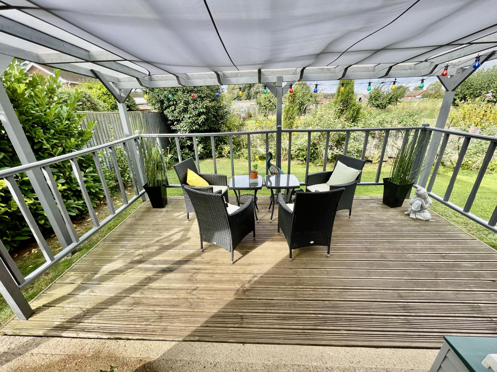 The rear garden has a raised decking area with covered pergoda, mainly laid to lawn, a wide range of mature shrubs and trees.