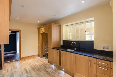 4.93.4.84 (16'2".15'10") - Window to rear aspect, modern range of wall and base units with quartz work tops, sink with mixer taps, plumbing for a dishwasher, integral electric double oven, microwave with plate warming tray, induction hob with extractor fan, integrated, full height fridge/freezer, wooden beams painted white, engineered wooden flooring, underfloor heating, power points, radiator.