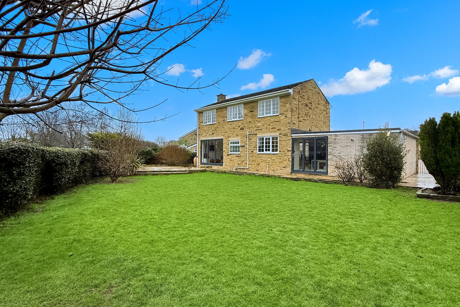 - Large rear garden with raised Indian stone patio