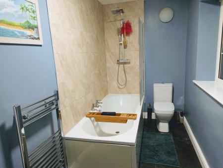 EN-SUITE BATHROOM 12' 3" x 5' 2" (3.73m x 1.57m) A three piece white suite comprising panelled bath with tiled surrounds, shower and screen above, low flush w.c., vanity wash basin with cupboards and drawers under, tiled splashback, double glazed window, chrome heated towel rail, extractor fan.